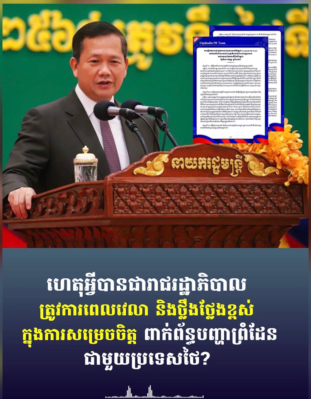 សម្តេចធិបតី ហ៊ុន ម៉ាណែត នាយករដ្ឋមន្ត្រីកម្ពុជា បានថ្លែងថា ប្រជាពលរដ្ឋគ្រប់រូបទាំងព្រះមហាក្សត្រ មន្ត្រីរាជរដ្ឋាភិបាល និងប្រជាពលរដ្ឋសាមញ្ញ សុទ្ធតែកំពុងបារម្ភពីបញ្ហាទឹកដី តែសម្រាប់រាជរដ្ឋាភិបាលរាល់ការសម្រេចចិត្ត