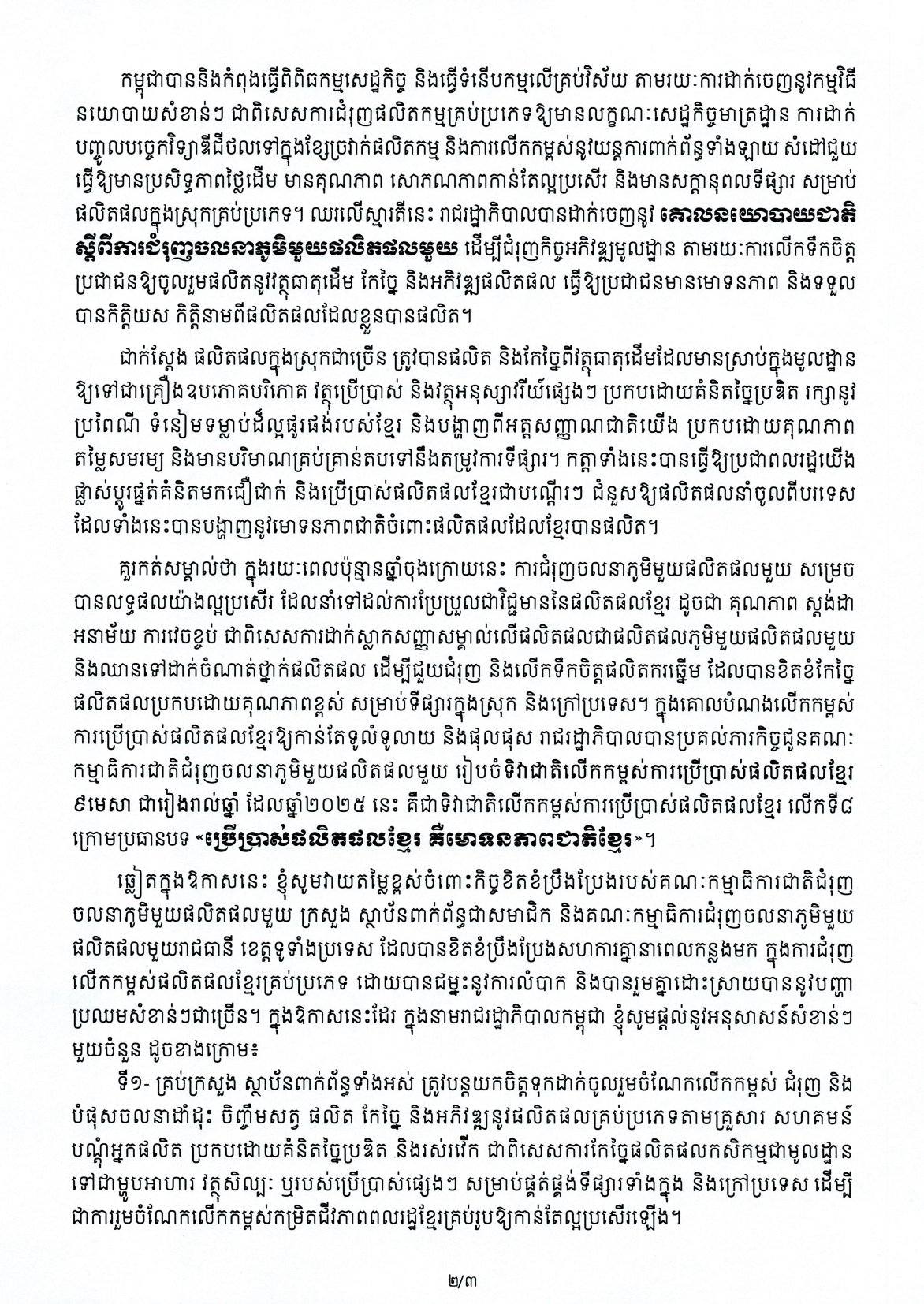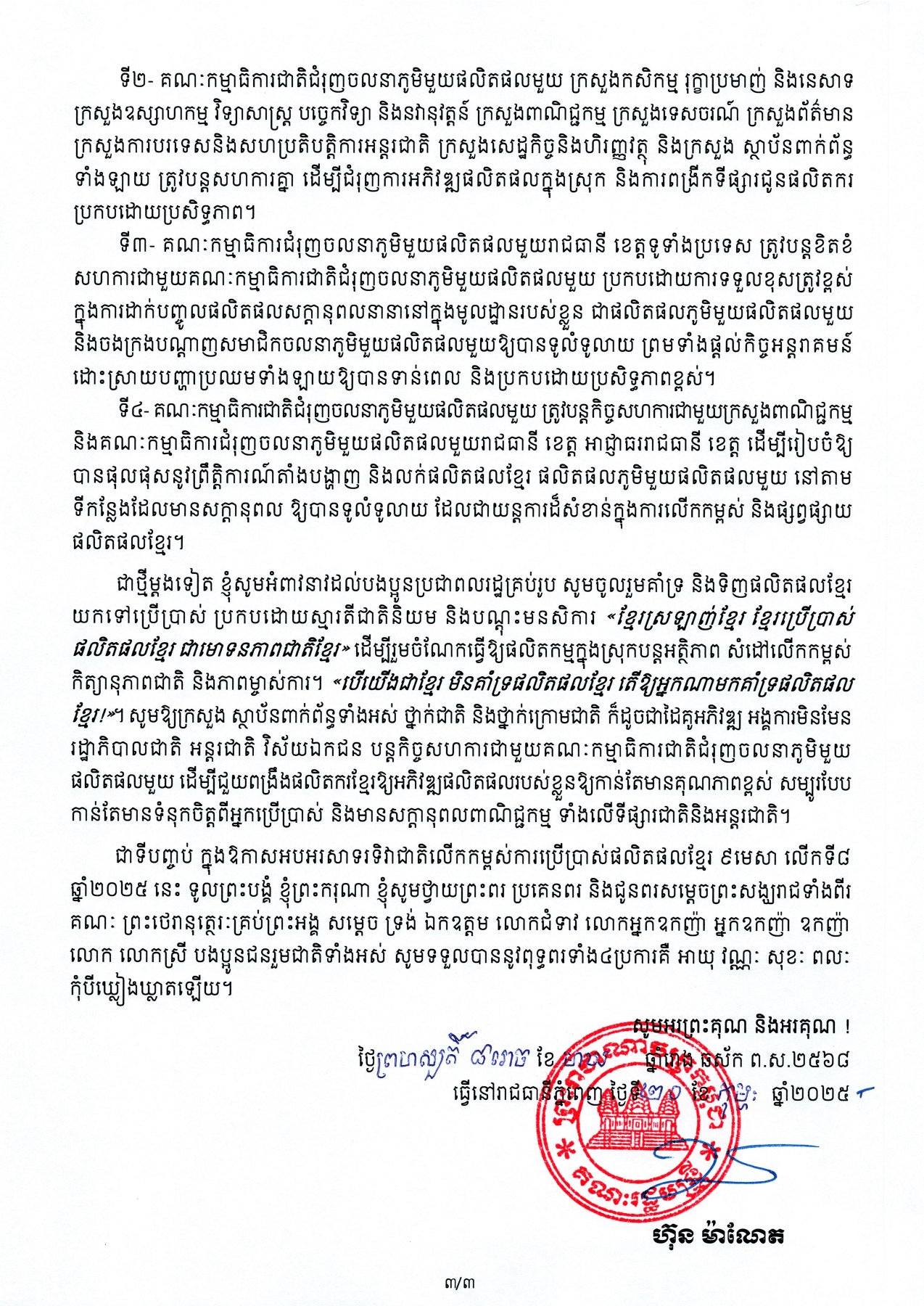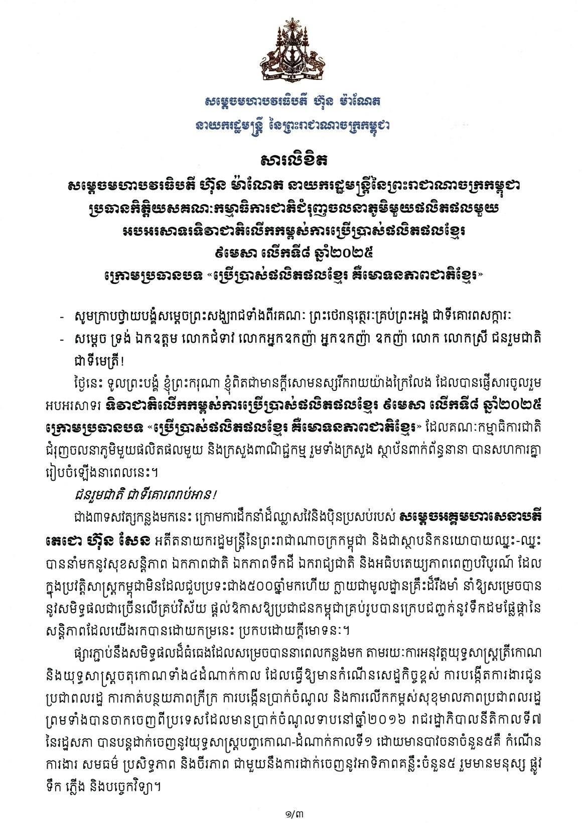 សារលិខិត សម្តេចមហាបវរធិបតី ហ៊ុន ម៉ាណែត នាយករដ្ឋមន្ត្រីនៃព្រះរាជាណាចក្រកម្ពុជា និងជាប្រធានកិត្តិយសគណៈកម្មាធិការជាតិជំរុញចលនាភូមិមួយផលិតផលមួយ ក្នុងឱកាសអបអរសាទរទិវាជាតិលើកកម្ពស់ការប្រើប្រាស់ផលិតផលខ្មែរ ៩មេសា លើកទី៧ ឆ្នាំ២០២៤ ក្រោមប្រធានបទ “ផលិតនិងផ្គត់ផ្គង់ទីផ្សារប្រកបដោយចីរភាព គឺជាចលនាភូមិ១ផលិតផល១”