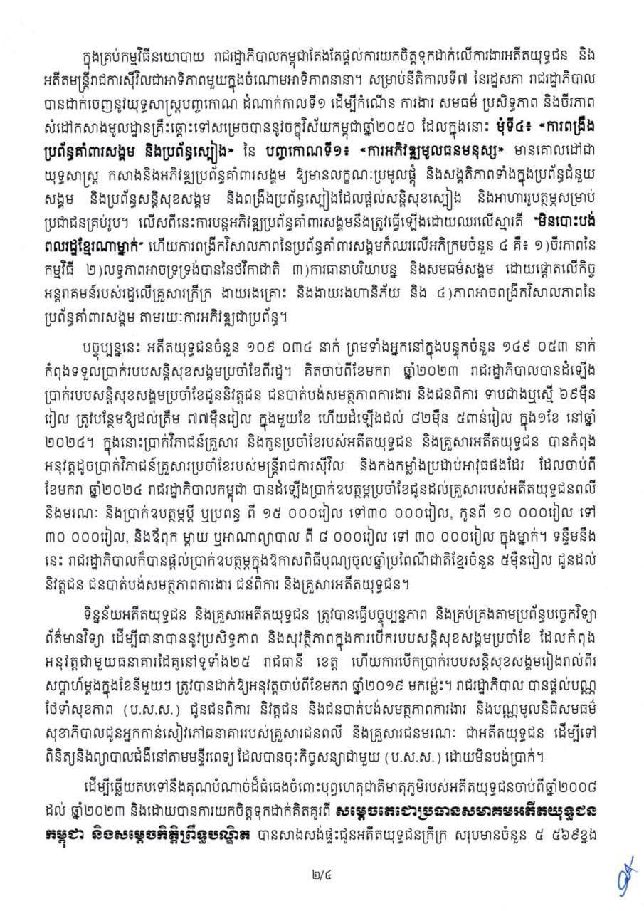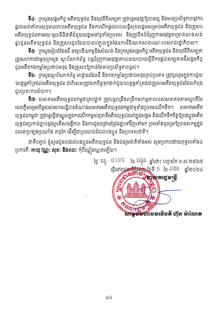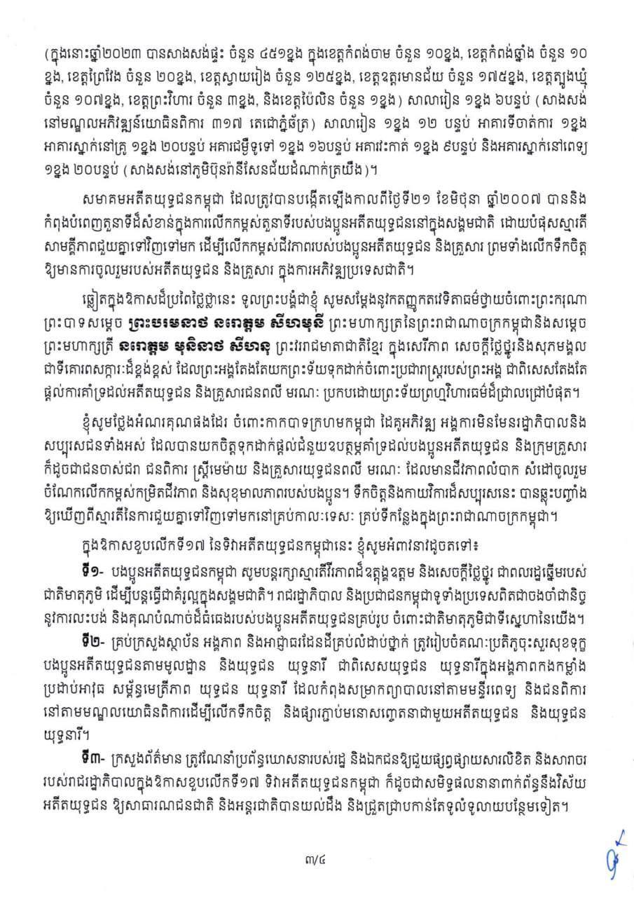 លើសពីនេះ សម្ដេចធិបតី ហ៊ុន ម៉ាណែត បានគូសបញ្ជាក់បន្ថែមទៀតថា សង្រ្គាមដែលបង្កឡើងដោយជនក្បត់ជាតិមួយក្តាប់តូចឃុបឃិតជាមួយបរទេស បានបង្កសង្រ្គាមវិនាសកម្មនិងរបបប្រល័យពូជសាសន៍ប៉ុល ពត បានបំផ្លិចបំផ្លាញសង្គមសេដ្ឋកិច្ចឱ្យខ្ទេចខ្ទីដល់ឬសគល់ ថែមទាំងបានបន្សល់ទុកនូវអតីតយុទ្ធជនដែលជាជនពិការ និវត្តជន ជនបាត់បង់សមត្ថភាពការងារ និងគ្រួសារយុទ្ធជនពលីមរណៈជាច្រើន។ ចាប់តាំងពីក្រោយថ្ងៃរំដោះ ៧ មករា ១៩៧៩ រាជរដ្ឋាភិបាលបានយកចិត្តទុកដាក់ខ្ពស់ក្នុងការអនុវត្តគោលនយោបាយនានាដើម្បីលើកកម្ពស់សុខុមាលភាព និងជីវភាពរស់នៅរបស់បងប្អូនអតីតយុទ្ធជនឱ្យបានល្អប្រសើរជាបន្តបន្ទាប់៕