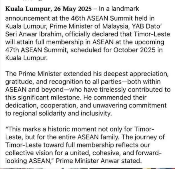ប្រទេសទីម័រឡេស្តេ នឹងក្លាយជាសមាជិកទី១១ របស់អាស៊ាន ជាផ្លូវការ នៅខែតុលា ឆ្នាំ២០២៥ខាងមុខ។ ឯកឧត្តមនាយករដ្ឋមន្រ្តីម៉ាឡេស៊ី Anwar Ibrahim បានថ្លែងថា ប្រទេសទីម័រឡេស្តេនឹងចូលជាសមាជិកពេញសិទ្ធិទី១១ របស់អាស៊ាន នៅក្នុងកិច្ចប្រជុំកំពូលអាស៊ាន លើកទី៤៧ ខាងមុខនេះ ដែលគ្រោងធ្វើនៅក្រុងគូឡាឡាំពួ ប្រទេសម៉ាឡេស៊ី នាខែតុលា។