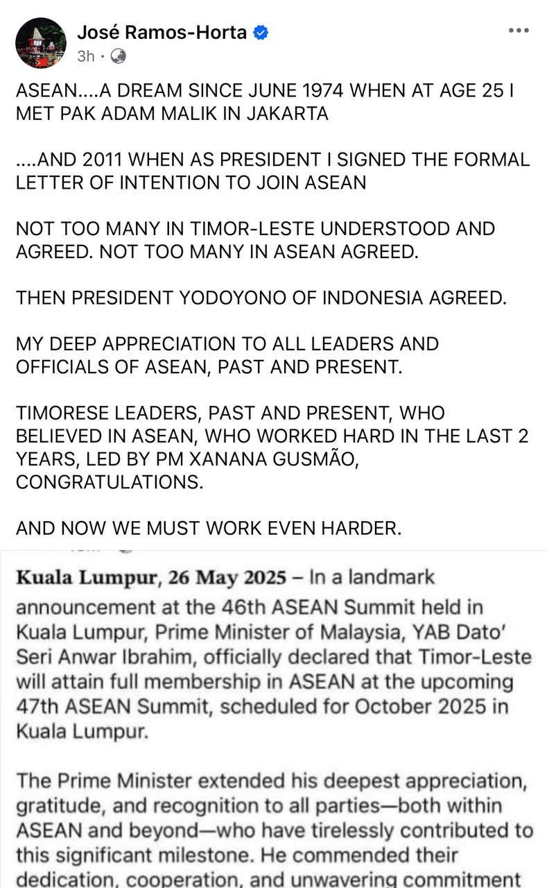 ចំណែកលោកប្រធានាធិបតីប្រទេសទីម័រឡេស្តេបានសរសេរនៅលើហ្វេសប៊ុករបស់លោកនៅរសៀលថ្ងៃទី២៦ ខែឧសភាថា «អាស៊ាន…ក្តីសុបិន្តតាំងពីខែមិថុនា ឆ្នាំ១៩៧៤…