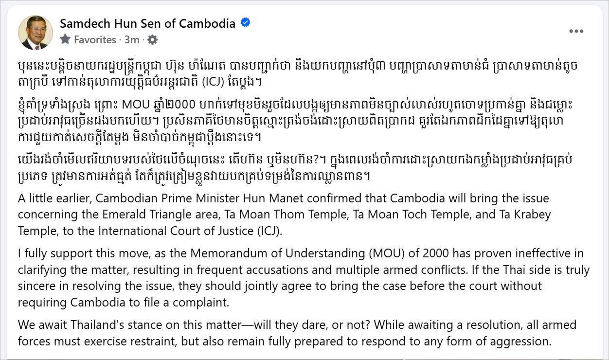មុននេះបន្តិចនាយករដ្ឋមន្ត្រីកម្ពុជា ហ៊ុន ម៉ាណែត បានបញ្ជាក់ថា នឹងយកបញ្ហានៅមុំ៣ បញ្ហាប្រាសាទតាមាន់ធំ ប្រាសាទតាមាន់តូច ប្រាសាទតាក្របី ទៅកាន់តុលាការយុត្តិធម៌អន្តរជាតិ (ICJ) តែម្តង។