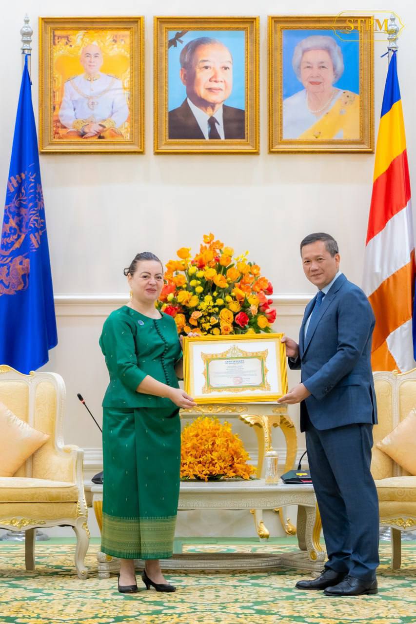 នារសៀលថ្ងៃអង្គារ ទី១ ខែកក្កដា ២០២៥, សម្ដេចមហាបវរធិបតី ហ៊ុន ម៉ាណែត នាយករដ្ឋមន្ត្រីនៃព្រះរាជាណាចក្រកម្ពុជា បានអនុញ្ញាតឱ្យលោកស្រី Alissar Chaker អ្នកតំណាងកម្មវិធីអភិវឌ្ឍន៍អង្គការសហប្រជាជាតិប្រចាំនៅកម្ពុជា (UNDP) ចូលជួបសម្ដែងការគួរសម និងជម្រាបលា នៅវិមានសន្ដិភាព។
