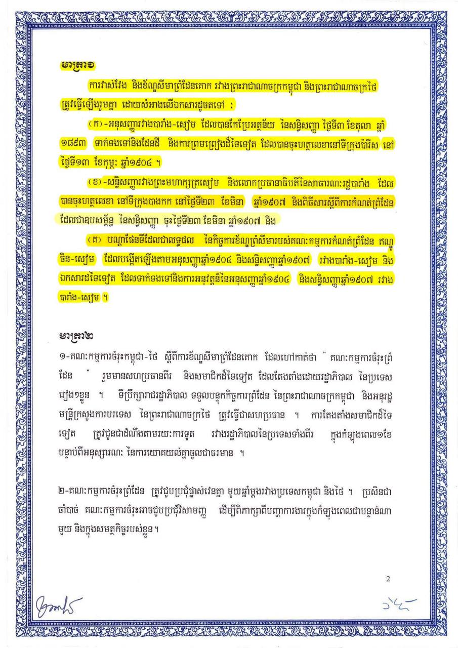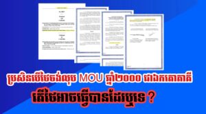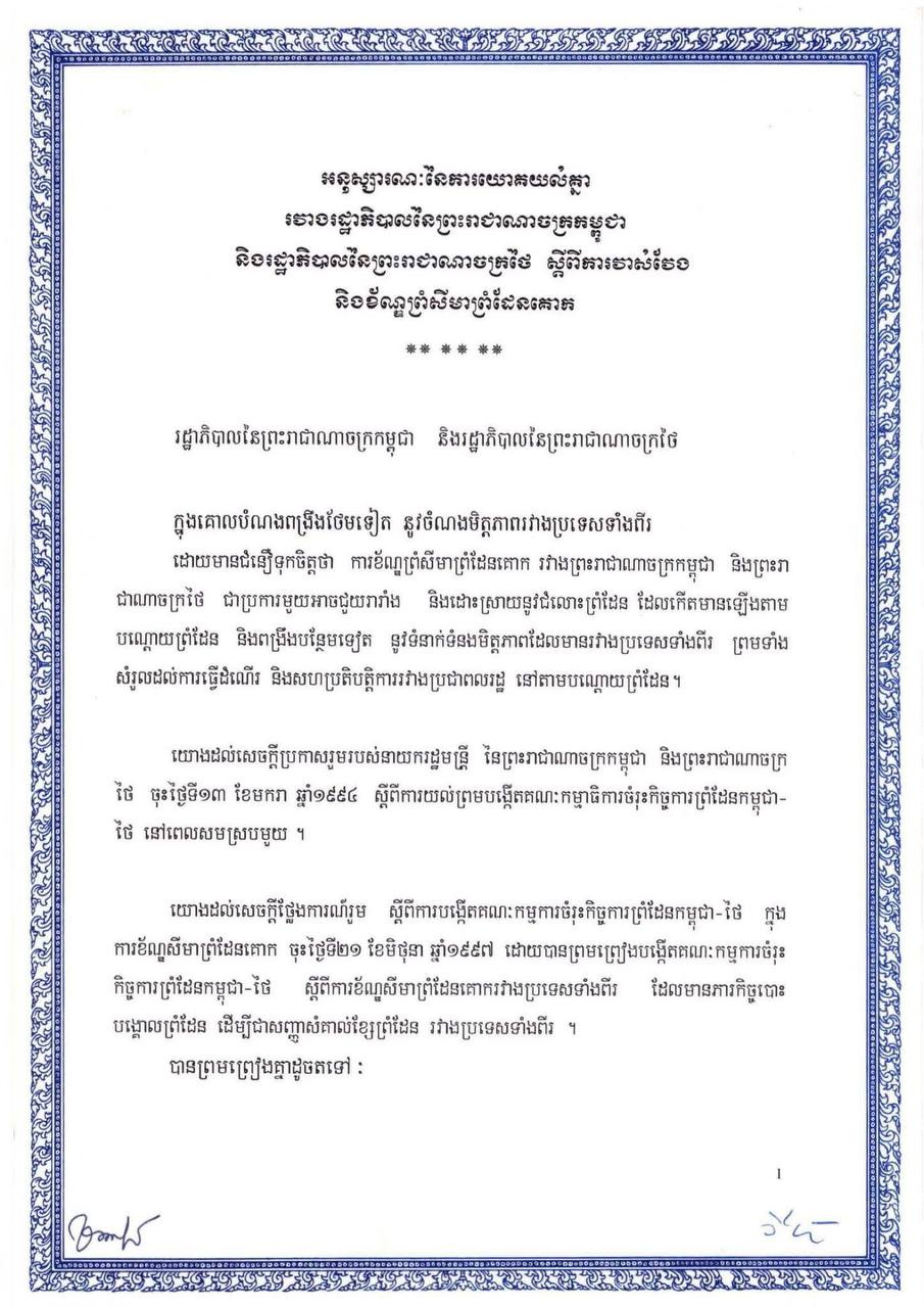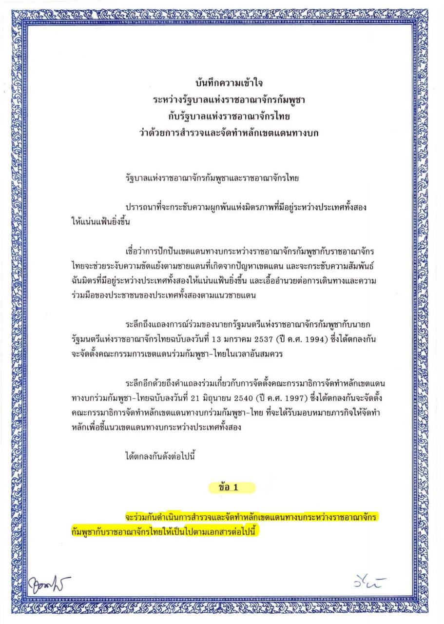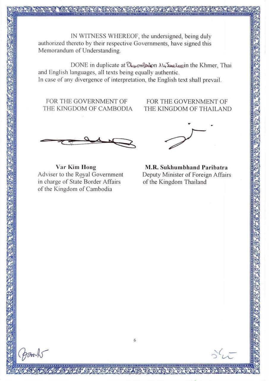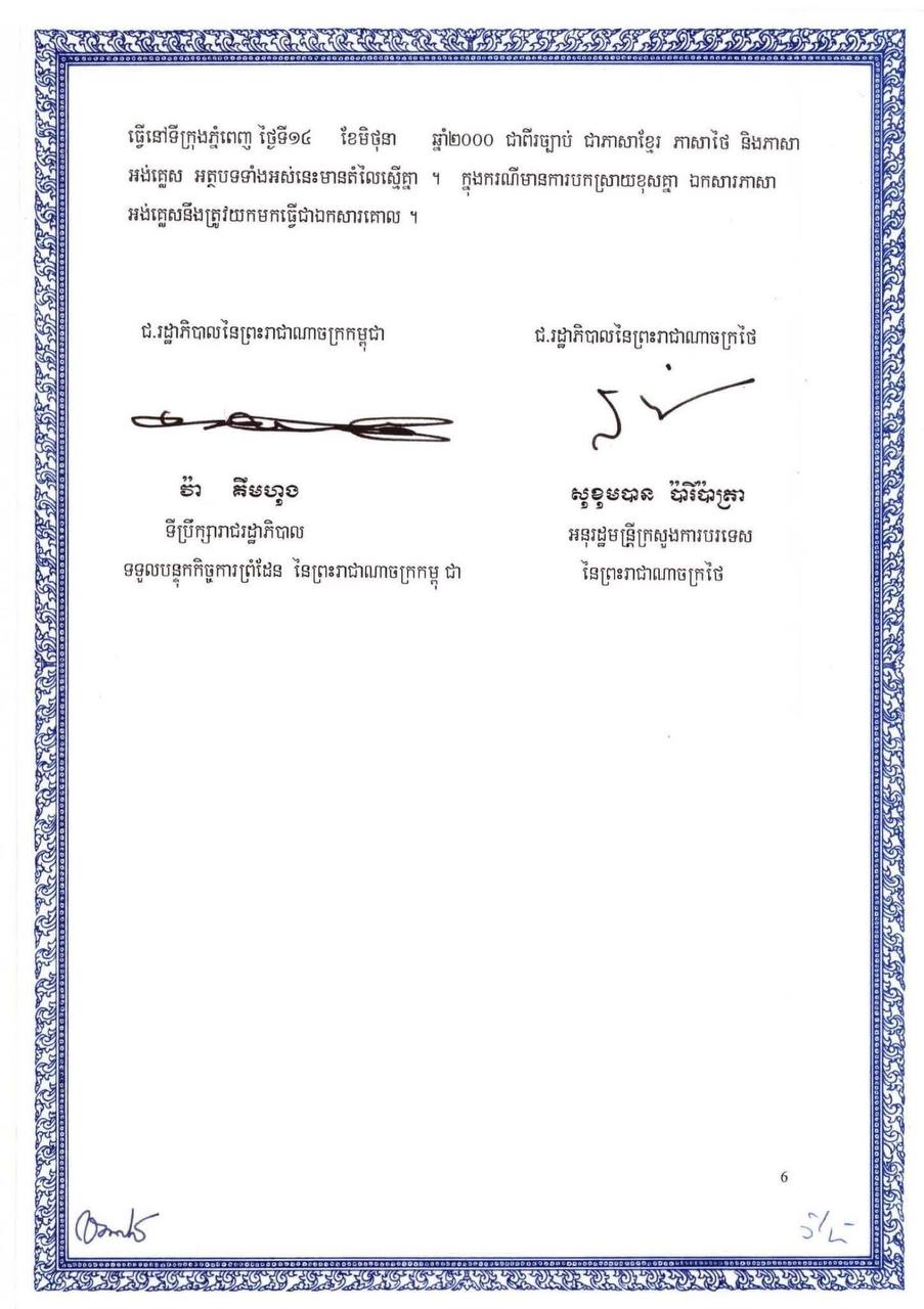 រដ្ឋលេខាធិការដ្ឋានកិច្ចការព្រំដែន | ឯកសារអនុស្សរណៈនៃការយោគយល់គ្នា ចុះថ្ងៃទី១៤ ខែមិថុនា ឆ្នាំ២០០០ ស្តីពីការវាស់វែង និងខណ្ឌសីមាព្រំដែនគោករវាងរាជរដ្ឋាភិបាលកម្ពុជា និងរាជរដ្ឋាភិបាលថៃ ( ហៅកាត់ថា MOU ឆ្នាំ២០០០ ) ដែលជាឯកសារផ្លូវការធ្វើឡើងជាបីភាសា មានខ្លឹមសារទាំងស្រុងដូចភ្ជាប់ជូន។