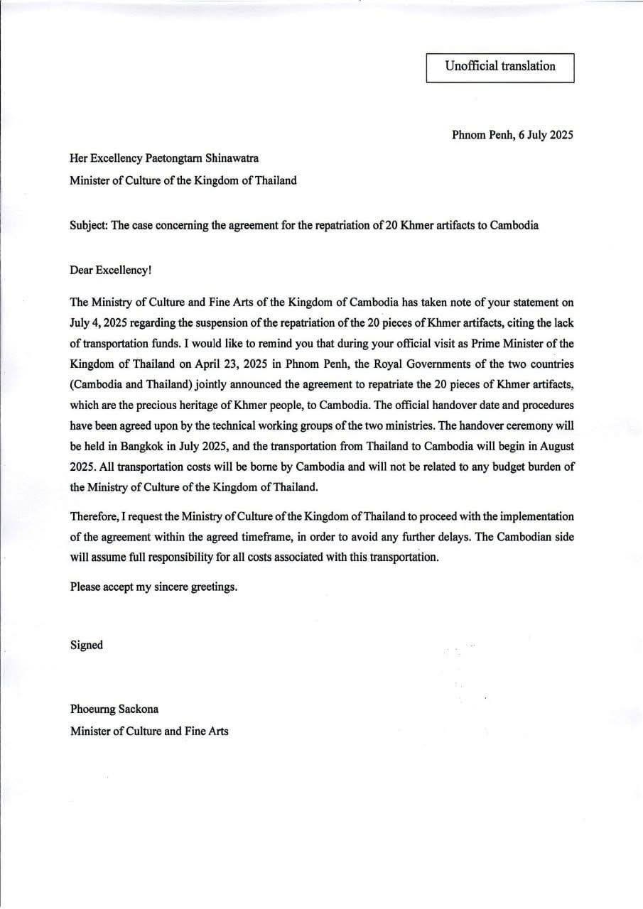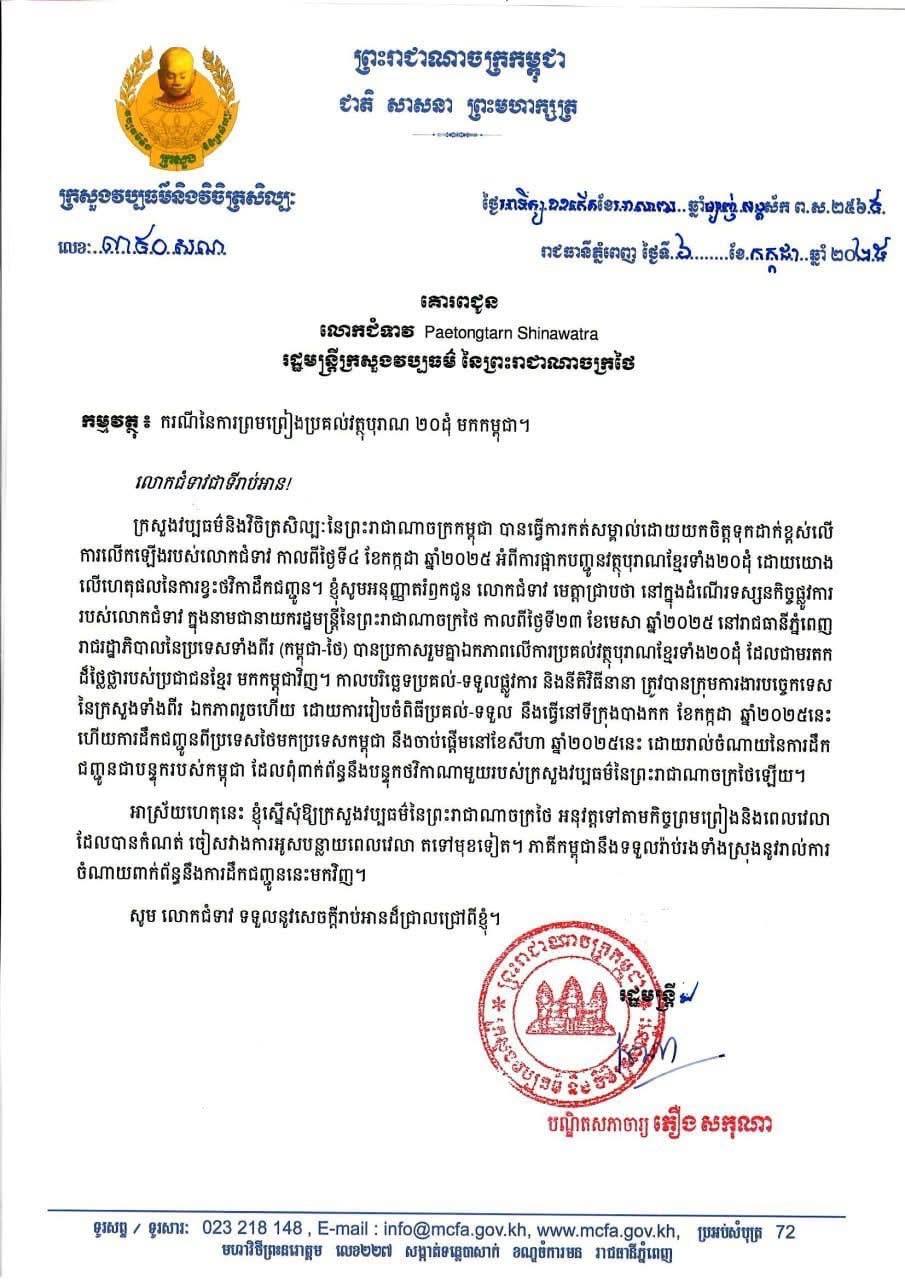 ក្នុងលិខិតបែកធ្លាយដែលបង្ហោះនៅលើ Facebook ឈ្មោះ The Troll ASEAN នៅថ្ងៃទី៦ ខែកក្កដា ឆ្នាំ២០២៥នេះ រដ្ឋមន្ដ្រីក្រសួងវប្បធម៌កម្ពុជា បានអះអាងថា នៅក្នុងដំណើរទស្សនកិច្ចផ្លូវការរបស់លោកស្រី ផែថងថាន ក្នុងនាមជានាយករដ្ឋមន្ត្រីនៃព្រះរាជាណាចក្រថៃ កាលពីថ្ងៃទី២៣ ខែមេសា ឆ្នាំ២០២៥ នៅរាជធានីភ្នំពេញ រាជរដ្ឋាភិបាលនៃប្រទេសទាំងពីរ (កម្ពុជា-ថៃ) បានប្រកាសរួមគ្នាឯកភាពលើការប្រគល់វត្ថុបុរាណខ្មែរទាំង២០ដុំ ដែលជាមរតកដ៏ថ្លៃថ្លារបស់ប្រជាជនខ្មែរ មកកម្ពុជាវិញ។