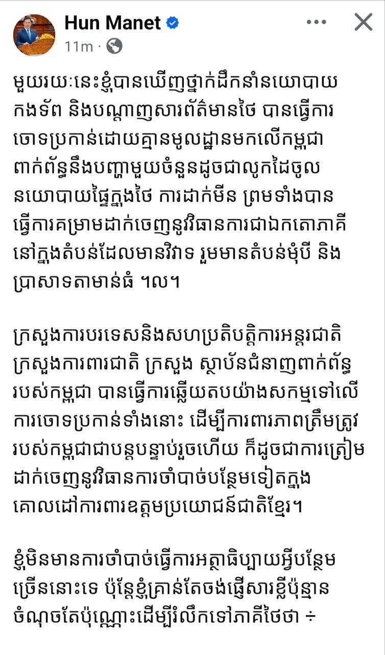 សម្ដេចធិបតី ហ៊ុន ម៉ាណែត នាយករដ្ឋមន្ត្រីនៃកម្ពុជាតាមរយៈបណ្ដាញសង្គម នៅព្រឹកថ្ងៃទី២២ ខែកក្កដា ឆ្នាំ ២០២៥ បានធ្វើការឆ្លើយតបចំពោះការចោទប្រកាន់ពីភាគីថៃដែលមានខ្លឹមសារដូចថ្ងៃក្រោម៖