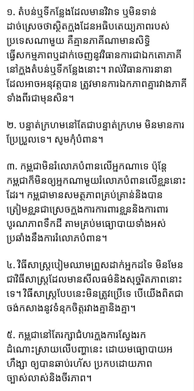 ៥. កម្ពុជានៅតែរក្សាជំហរក្នុងការស្វែងរកដំណោះស្រាយលើបញ្ហានេះ ដោយមធ្យោបាយអហឹង្សា ឲ្យបានឆាប់រហ័ស ប្រកបដោយភាពច្បាស់លាស់និងចីរភាព៕