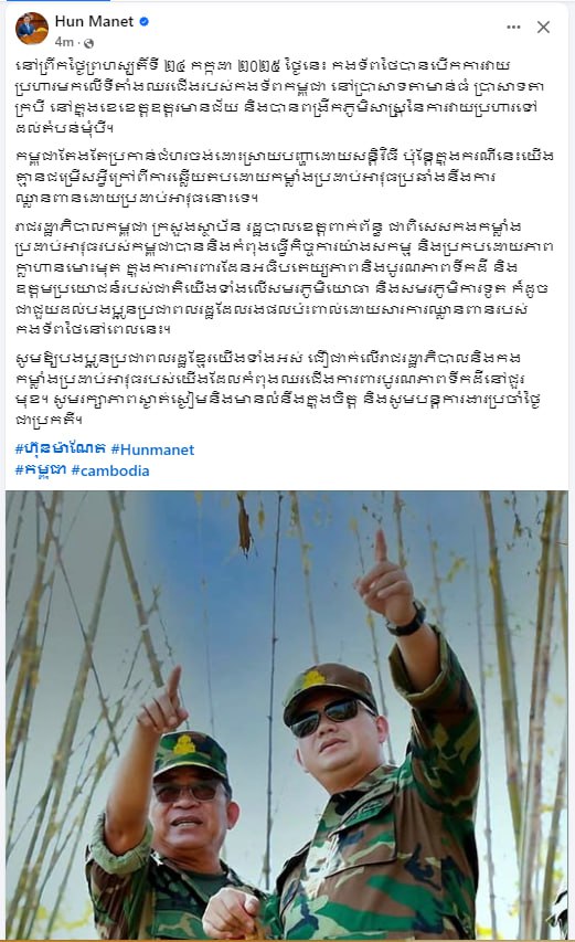 សម្តេចធិបតី ហ៊ុន ម៉ាណែត នាយករដ្ឋមន្ត្រីនៃកម្ពុជា តាមរយៈបណ្តាញសង្គមនៅព្រឹកថ្ងៃទី២៤ ខែកក្កដា ឆ្នាំ២០២៥ បានបង្ហោះផ្សាយខ្លឹមសារដូចតទៅ៖