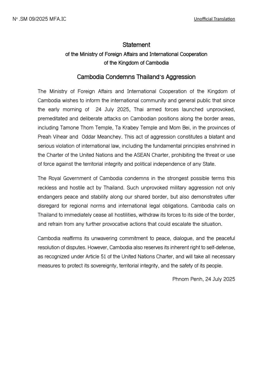 រាជរដ្ឋាភិបាលកម្ពុជា ថ្កោលទោសយ៉ាងម៉ឺងម៉ាត់បំផុត ចំពោះទង្វើគ្មានការគិតគូរ និងអរិភាពនេះ របស់ប្រទេសថៃ។ ការឈ្លានពានខាងយោធាដោយគ្មានមូលហេតុបែបនេះមិនត្រឹមតែបង្កគ្រោះថ្នាក់ដល់ សន្តិភាព និងស្ថិរភាពនៅតាមព្រំដែនរួមរបស់យើងប៉ុណ្ណោះទេ ប៉ុន្តែថែមទាំងបង្ហាញពីការមិនយកចិត្ត ទុកដាក់ចំពោះបទដ្ឋានក្នុងតំបន់ និងកាតព្វកិច្ចផ្លូវច្បាប់អន្តរជាតិផងដែរ។ កម្ពុជាអំពាវនាវឲ្យថៃបញ្ឈប់ រាល់អរិភាពជាបន្ទាន់ ដកកម្លាំងទៅខាងព្រំដែនរបស់ខ្លួន និងចៀសវាងសកម្មភាពញុះញង់ដែលអាចធ្វើ ឲ្យស្ថានការណ៍កាន់តែតានតឹង។