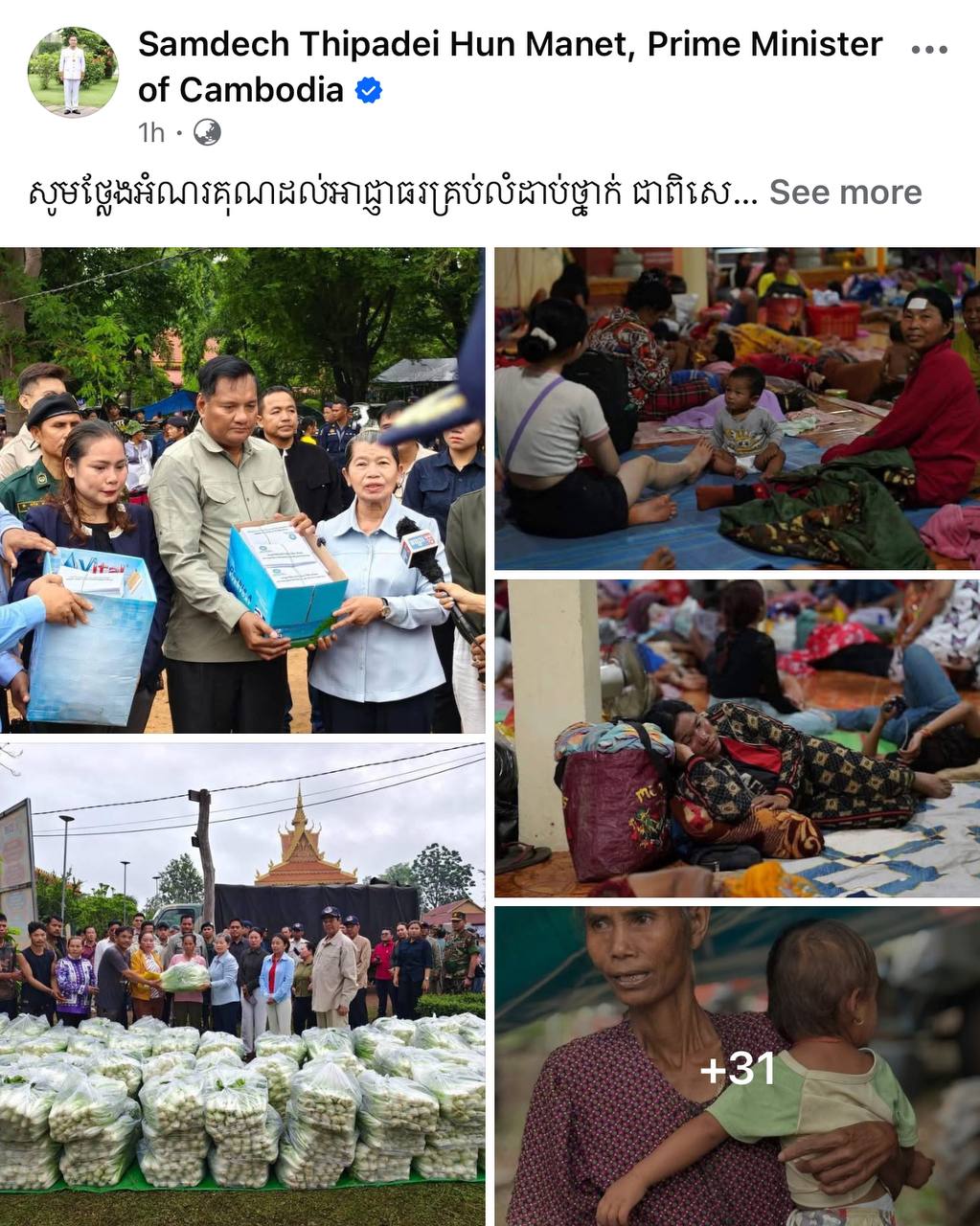 សម្ដេចធិបតី ហ៊ុន ម៉ាណែត នាយករដ្ឋមន្រ្ដីនៃកម្ពុជា នៅលើបណ្ដាញសង្គមផ្លូវការ នារសៀលថ្ងៃទី២៧ ខែកក្កដា ឆ្នាំ២០២៥នេះ បានថ្លែងអំណរគុណដល់អាជ្ញាធរគ្រប់លំដាប់ថ្នាក់ ជាពិសេសអាជ្ញាធរខេត្តព្រះវិហារ, ឧត្តរមានជ័យ, បន្ទាយមានជ័យ, បាត់ដំបង, ពោធិ៍សាត់ និងខេត្តសៀមរាប ដែលបានយកចិត្តទុកដាក់ក្នុងការរៀបចំទីជម្រកសុវត្ថិភាពដល់បងប្អូនប្រជាពលរដ្ឋភៀសសឹក ចាកចេញពីភូមិឋានដ៏កក់ក្តៅរបស់ខ្លួន តែប្រែក្លាយជាទីតាំងផុយស្រួយ បណ្តាលមកពីសង្គ្រាមឈ្លានពានពីសំណាក់ប្រទេសថៃ ដើម្បីរំលោភយកទឹកដីកម្ពុជាយ៉ាងកំរោល។