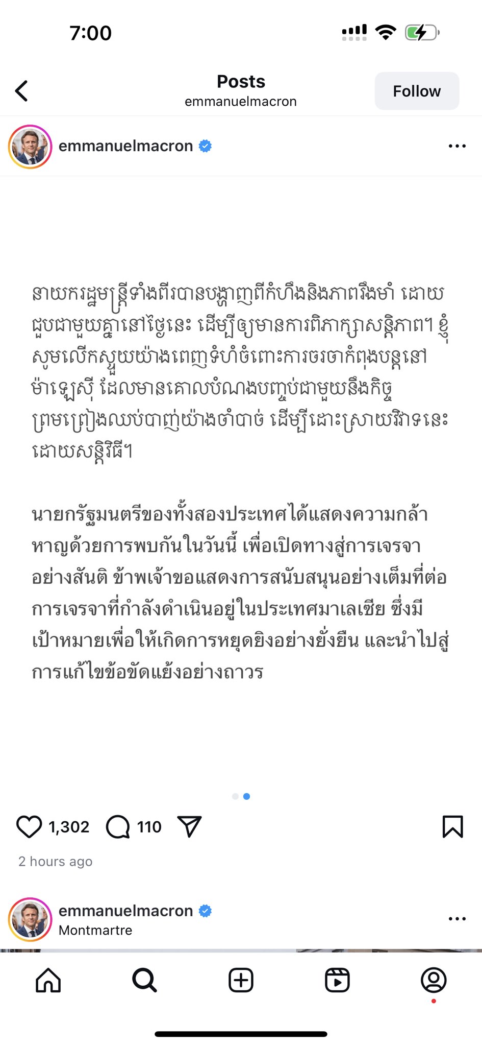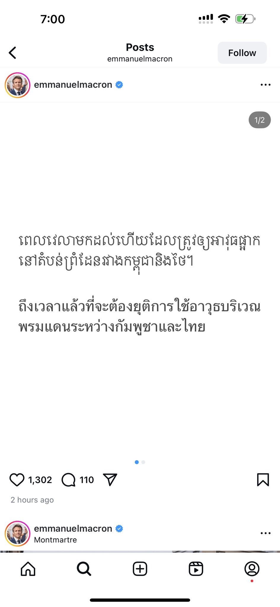 (ភ្នំពេញ)៖ លោកប្រធានាធិបតីបារាំង លោក ម៉ាកក្រុង នៅថ្ងៃទី២៨ ខែកក្កដា ឆ្នាំ២០២៥នេះ តាមរយៈបណ្តាញ Instagram របស់ខ្លួន ដោយបញ្ជាក់ថា លោកគាំទ្រចំពោះការចរចា ក្នុងបំណងព្រមព្រៀងឈប់បាញ់យ៉ាងចាំបាច់ ដើម្បីដោះស្រាយវិវាទដោយសន្តិវិធី។