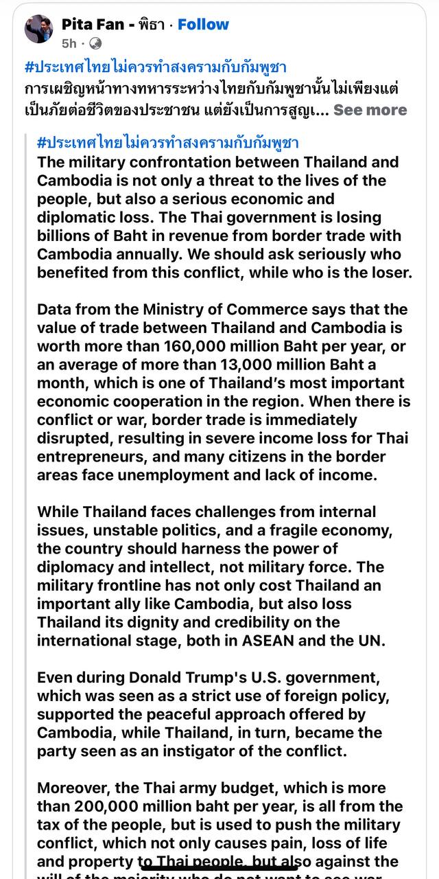 អតីតមេដឹកនាំគណបក្ស Move Forward លោកភីថា លីមចារ៉ឺនរ៉ាត់ បានស្តីបន្ទោសថា ការដឹកនាំរបស់លោកថាក់ស៉ីននាំឱ្យពលរដ្ឋថៃរងនូវការអាម៉ាស់ និងខាតបង់សេដ្ឋកិច្ចជាតិរាប់ពាន់លានព្រោះតែជម្លោះជាមួយកម្ពុជា