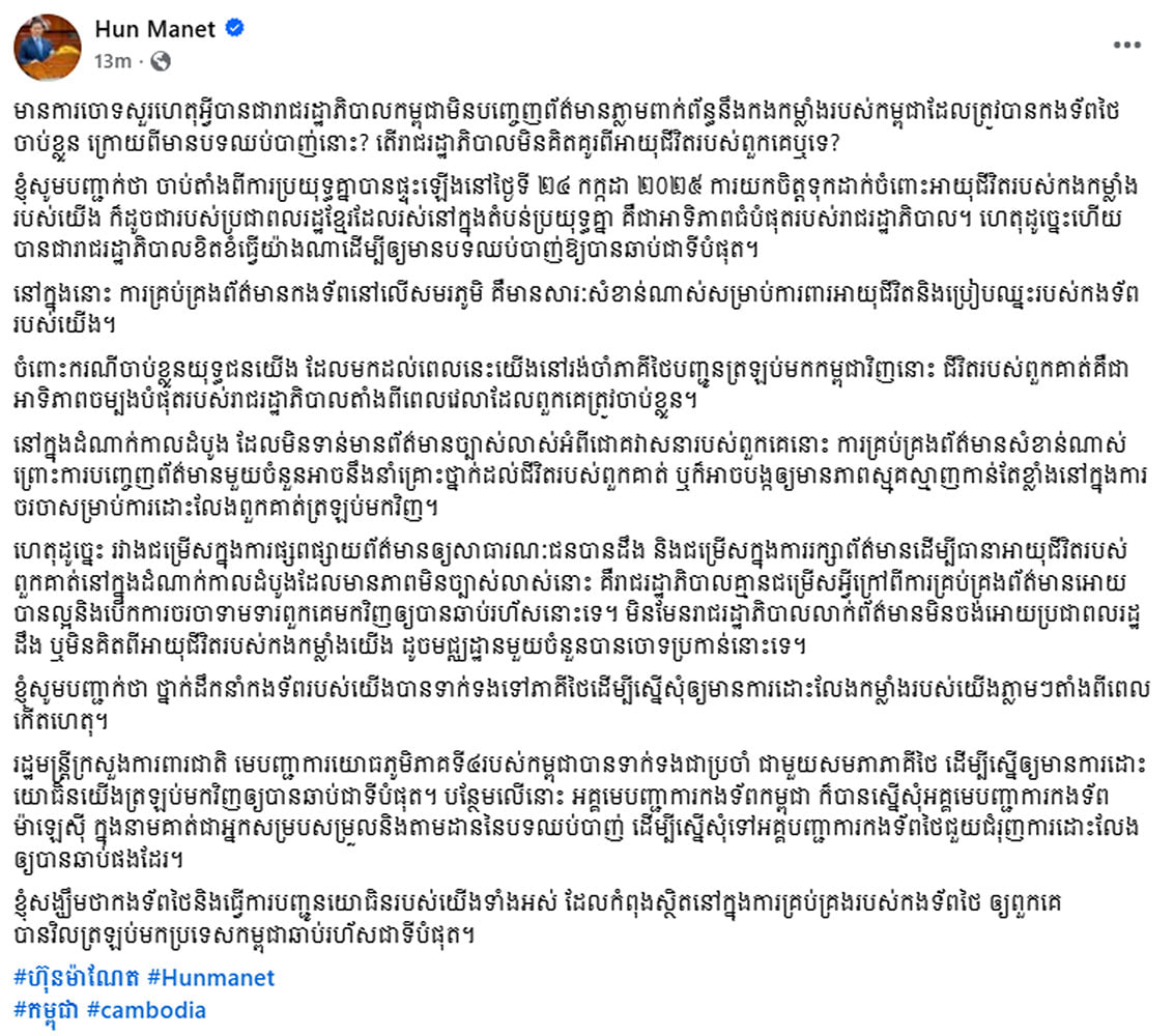 (ភ្នំពេញ)៖ នៅព្រឹកថ្ងៃទី៣១ ខែកក្កដា ឆ្នាំ២០២៥នេះ សម្តេចធិបតី ហ៊ុន ម៉ាណែត នាយករដ្ឋមន្រ្តីនៃកម្ពុជា បានបង្ហាញសារសំខាន់មួយពាក់ព័ន្ធ យោធិនរបស់យើងដែលកំពុងស្ថិតនៅក្នុងការគ្រប់គ្រងរបស់កងទ័ពថៃ និងបានស្នើសុំអគ្គមេបញ្ជាការកងទ័ពម៉ាឡេស៊ី ក្នុងនាមអ្នកសម្របសម្រួល និងតាមដាននៃបទឈប់បាញ់ ដើម្បីស្នើសុំទៅ អគ្គបញ្ជាការកងទ័ពថៃ ជួយជំរុញការដោះលែងបងប្អូនកងទ័ពយើងឲ្យបានឆាប់។