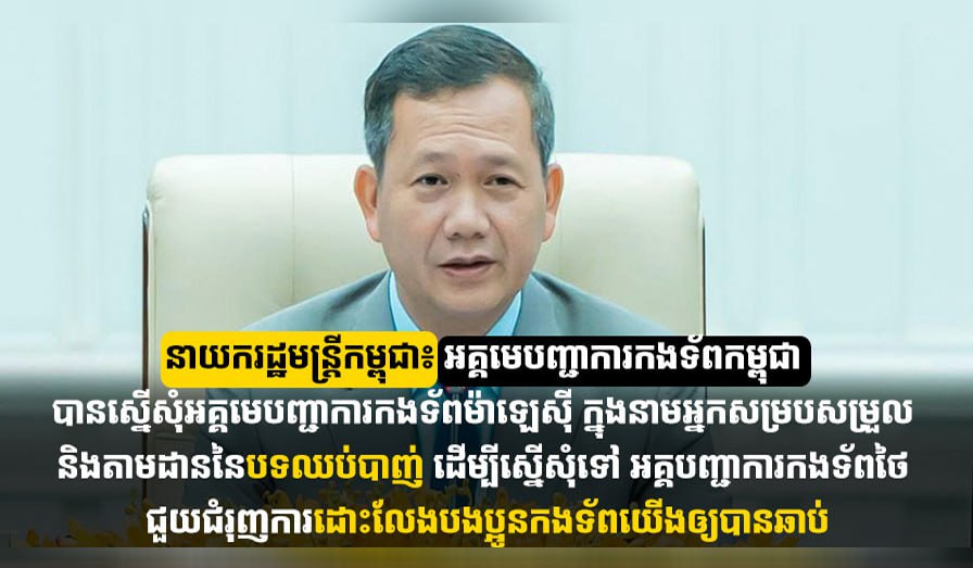 នាយករដ្ឋមន្រ្តីកម្ពុជា៖ អគ្គមេបញ្ជាការកងទ័ពកម្ពុជា បានស្នើសុំអគ្គមេបញ្ជាការកងទ័ពម៉ាឡេស៊ី ក្នុងនាមអ្នកសម្របសម្រួល និងតាមដាននៃបទឈប់បាញ់ ដើម្បីស្នើសុំទៅ អគ្គបញ្ជាការកងទ័ពថៃ ជួយជំរុញការដោះលែងបងប្អូនកងទ័ពយើងឲ្យបានឆាប់