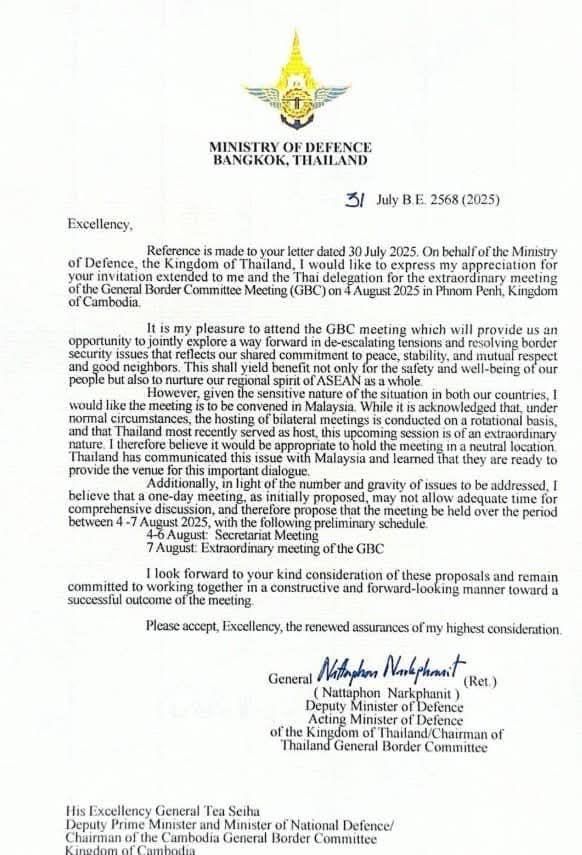 គួរបញ្ជាក់ថា កាលពីថ្ងៃទី៣១ ខែកក្កដា ឆ្នាំ២០២៥ ក្រសួងការពារជាតិកម្ពុជាបានឆ្លើយតបទៅនឹងលិខិតរបស់រដ្ឋមន្ត្រីស្ដីទីក្រសួងការពារជាតិថៃ ដោយបានឯកភាពទៅនឹងសំណើសុំប្ដូរទីតាំងនៃកិច្ចប្រជុំទៅធ្វើនៅប្រទេសម៉ាឡេស៊ី។ នៅក្នុងលិខិតរបស់ក្រសួងការពារជាតិកម្ពុជាដដែល ឯកឧត្តមឧបនាយករដ្ឋមន្ត្រី ទៀ សីហា បានស្នើត្រឡប់ទៅភាគីថៃវិញ សូមឲ្យម៉ាឡេស៊ី សហរដ្ឋអាម៉េរិក និងចិន ចូលរួមសង្កេតការណ៍នៅក្នុងកិច្ចប្រជុំនេះ៕