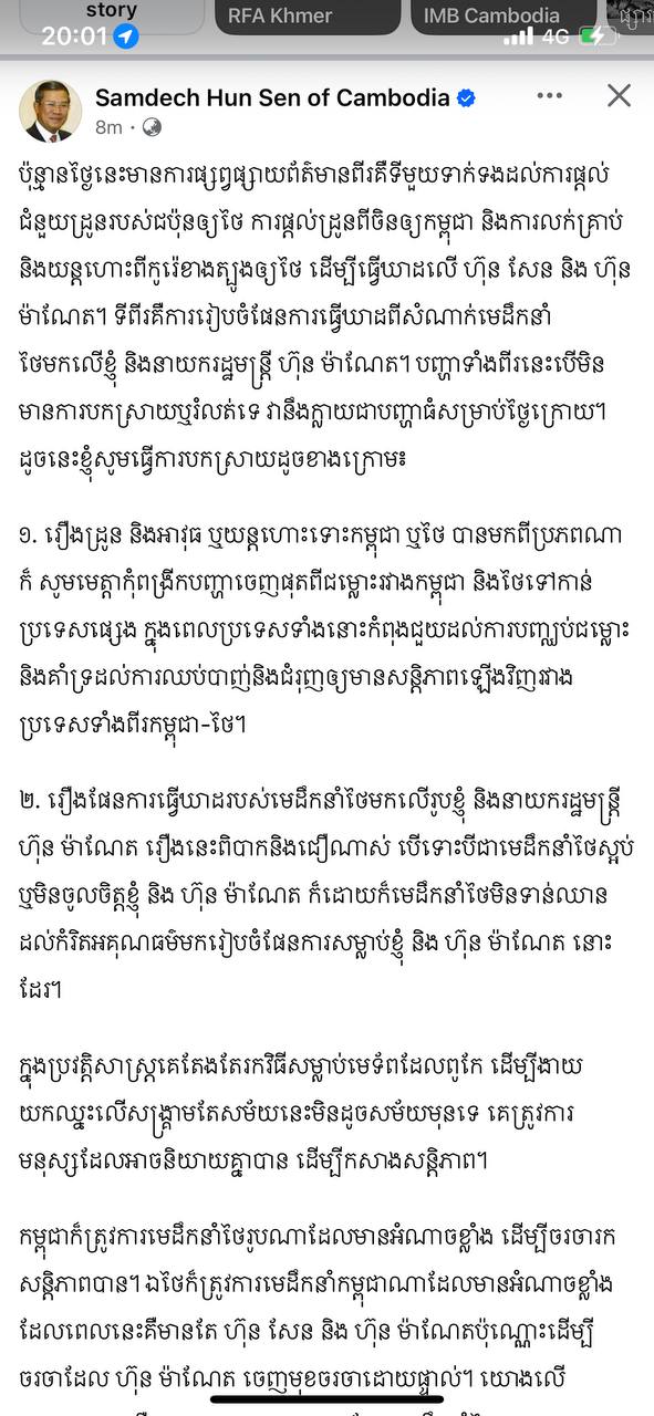 សម្តេចតេជោ ហ៊ុន សែន បកស្រាយទៅនឹងព័ត៌មានសំខាន់២ពាក់ព័ន្ធនឹងផែនការធ្វើឃាតសម្តេចនិងសម្តេចធិបតី ហ៊ុន ម៉ាណែត និងរឿងផ្តល់ដ្រូនដល់កម្ពុជានិងថៃ ហើយស្នើកុំឲ្យពង្រីកបញ្ហាចេញផុតពីជម្លោះរវាងកម្ពុជានិងថៃ ទៅកាន់ប្រទេសផ្សេង