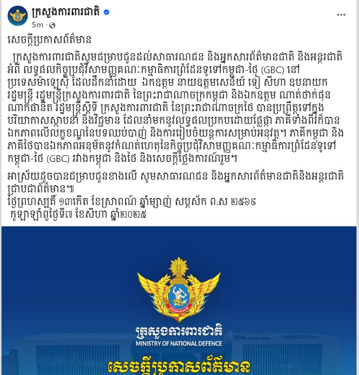 ក្រសួងការពារជាតិនៃព្រះរាជាណាចក្រកម្ពុជា តាមរយៈបណ្ដាញសង្គមនៅរសៀលថ្ងៃទី៧ ខែសីហា ឆ្នាំ២០២៥ បានបង្ហោះផ្សាយខ្លឹមសារដូចខាងក្រោម៖