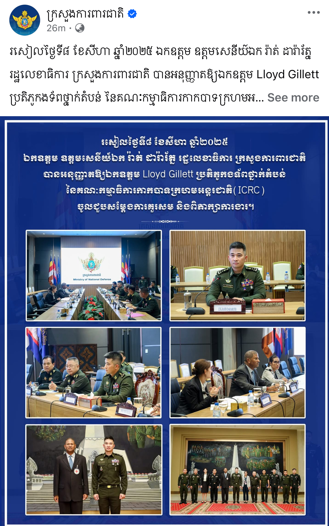 ក្រសួងការពារជាតិនៃព្រះរាជាណាចក្រកម្ពុជា តាមរយៈបណ្ដាញសង្គមផ្លូវការ បានបញ្ជាក់ថានៅ រសៀលថ្ងៃទី៨ ខែសីហា ឆ្នាំ២០២៥ ឯកឧត្តម ឧត្តមសេនីយ៍ឯក រ៉ាត់ ដារ៉ារ័ត្ន រដ្ឋលេខាធិការ ក្រសួងការពារជាតិ បានអនុញ្ញាតឱ្យឯកឧត្តម Lloyd Gillett ប្រតិភូកងទ័ពថ្នាក់តំបន់ នៃគណៈកម្មាធិការកាកបាទក្រហមអន្តរជាតិចូលជួបសម្តែងការគួរសម និងពិភាក្សាការងារ។ នៅក្នុងជំនួបនោះ ឯកឧត្តម Lloyd Gillett ក៏បានចែករំលែកផងដែរនូវព័ត៌មានអំពីការចុះសួរសុខទុក្ខនាយទាហានទាំង ១៨រូប នៃកងយោធពលខេមរភូមិន្ទ ដែលត្រូវបានភាគីថៃចាប់ខ្លួនដោយខុសច្បាប់ក្រោយបទឈប់បាញ់ចូលរជាធរមាន។