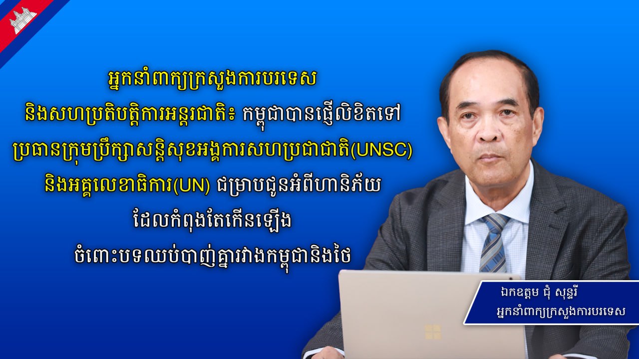 ឯកឧត្តម ជុំ សុន្ទរី អ្នកនាំពាក្យក្រសួងការបរទេសនិងសហប្រតិបត្តិការអន្តរជាតិ បានមានប្រសាសន៍ថា ឯកឧត្តមឧបនាយករដ្ឋមន្ត្រី ប្រាក់ សុខុន រដ្ឋមន្ត្រីក្រសួងការបរទេសនិងសហប្រតិបត្តិការអន្តរជាតិនៃប្រទេសកម្ពុជាបានសរសេរលិខិតដាច់ដោយឡែកផ្ញើជូនទៅប្រធានអង្គការសន្តិសុខអង្គការសហប្រជាជាតិ និងអគ្គលេខាធិការអង្គការសហប្រជាជាតិដើម្បីជម្រាបជូនអំពីហានិភ័យដែលកំពុងកើនឡើងនិងកំរាមគំហែងចំពោះបទឈប់បាញ់ដ៏ផុយស្រួយខ្លាំងរវាងកម្ពុជា-ថៃ។ លិខិតទាំងពីរនោះដែរ ក៏នឹងត្រូវចែកជូនជាផ្លូវការដល់ស្ថានតំណាងអចិន្ត្រៃយ៍របស់បណ្តាប្រទេសប្រចាំនៅអង្គការសហប្រជាជាតិនាទីក្រុងញូវយ៉កផងដែរ។
