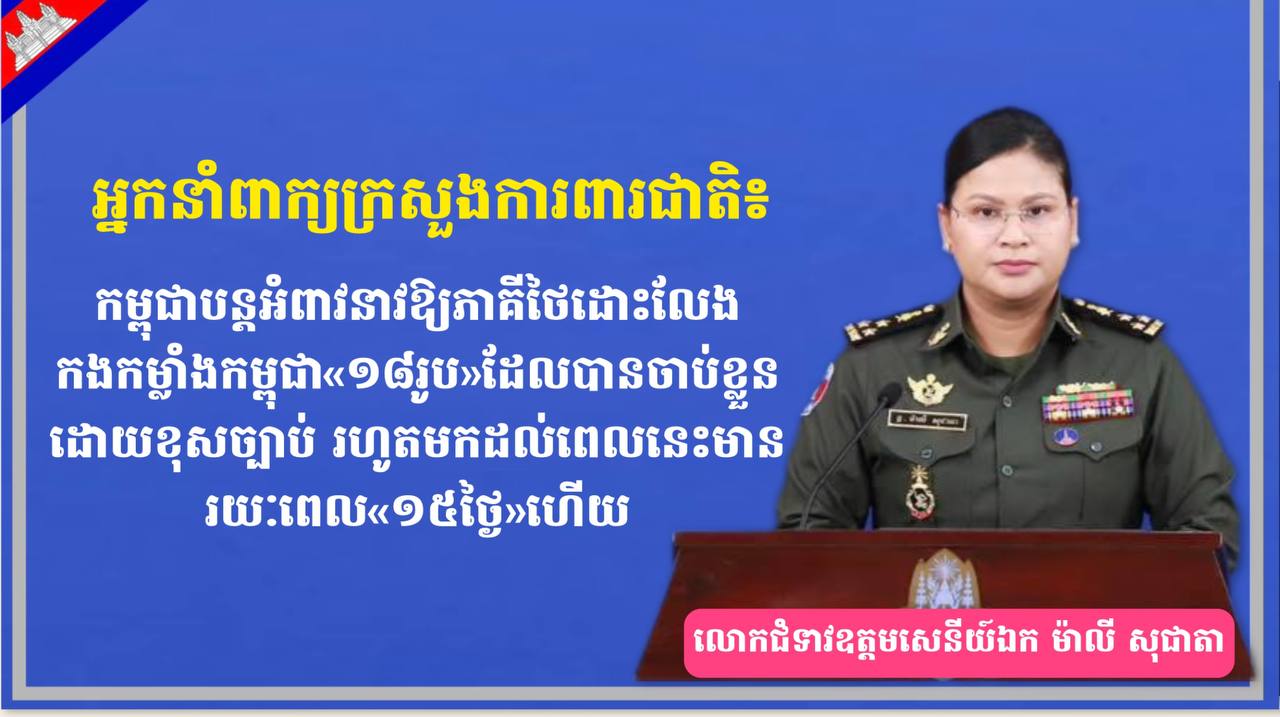 លោកជំទាវឧត្តមសេនីយ៍ឯក ម៉ាលី សុជាតា អ្នកនាំពាក្យក្រសួងការពារជាតិថ្លែងក្នុងសេចក្តីសង្ខេបព័ត៌មានប្រចាំថ្ងៃស្តីពី «លទ្ធផលនៃការអនុវត្តបទឈប់បាញ់រវាងកម្ពុជា-ថៃ» នាព្រឹកថ្ងៃទី១៣ ខែសីហា ឆ្នាំ២០២៥ បានមានប្រសាសន៍ថា គិតចាប់តាំងពីថ្ងៃទី២៩ ខែកក្កដា ឆ្នាំ២០២៥ វេលាម៉ោង ៧:៥០ នាទីក្រោយបទឈប់បាញ់ចូលជាធរមានភ្លាមៗដែលកងកម្លាំងរបស់យើងត្រូវបានទាហានថៃចាប់ខ្លួនដោយខុសច្បាប់មកទល់ពេលនេះមានរយៈពេល ១៥ថ្ងៃហើយគិតត្រឹមថ្ងៃទី១៣ ខែសីហា ឆ្នាំ២០២៥ នេះកម្ពុជាស្នើអោយភាគីថៃឆាប់បញ្ជូនកងកម្លាំងរបស់យើងទាំង១៨រូបអោយត្រឡប់មកវិញជាបន្ទាន់ស្របតាមច្បាប់មនុស្សធម៌អន្តរជាតិ និងស្របតាមការអំពាវនាវដ៏ទទូចរបស់បណ្តាប្រទេសដៃគូ និងស្ថាប័នអន្តរជាតិជាច្រើន។