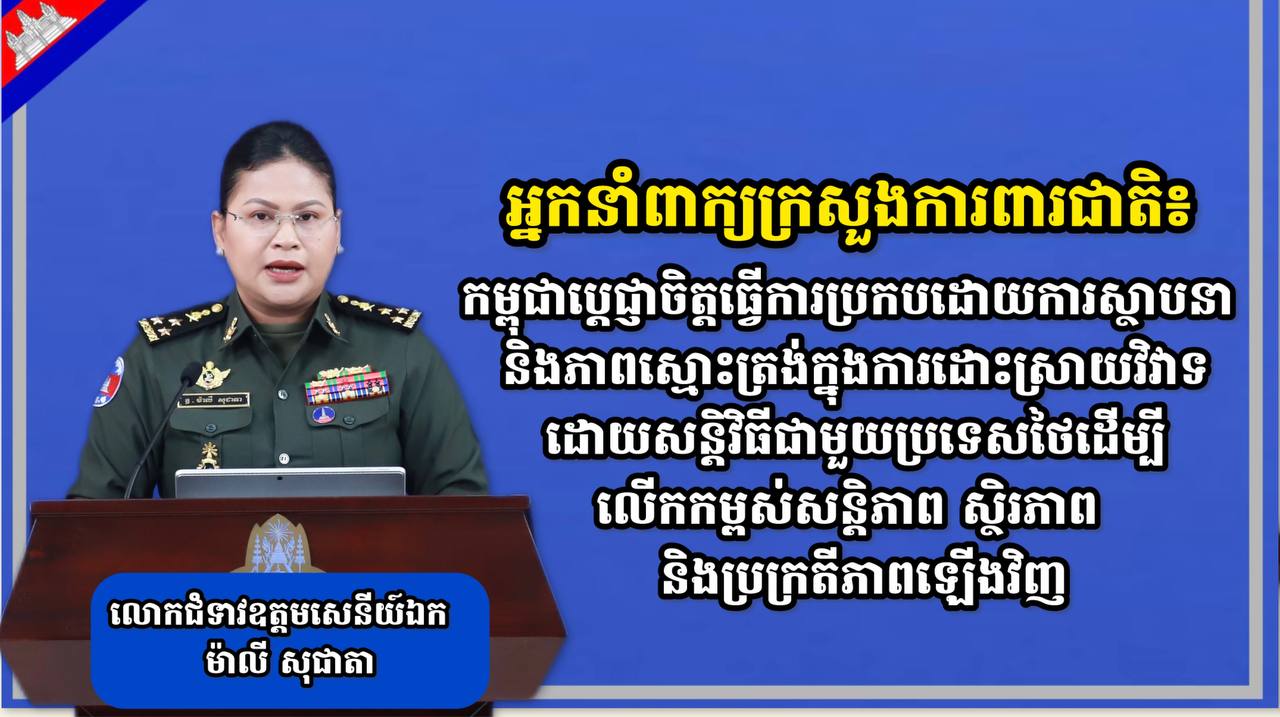 អ្នកនាំពាក្យក្រសួងការពារជាតិ៖កម្ពុជាបេ្តជ្ញាចិត្តធ្វើការប្រកបដោយការស្ថាបនា និងភាពស្មោះត្រង់ក្នុងការដោះស្រាយវិវាទដោយសន្តិវិធីជាមួយប្រទេសថៃដើម្បីលើកកកម្ពស់សន្តិភាព សិ្ថរភាព និងប្រក្រតីភាពឡើងវិញ