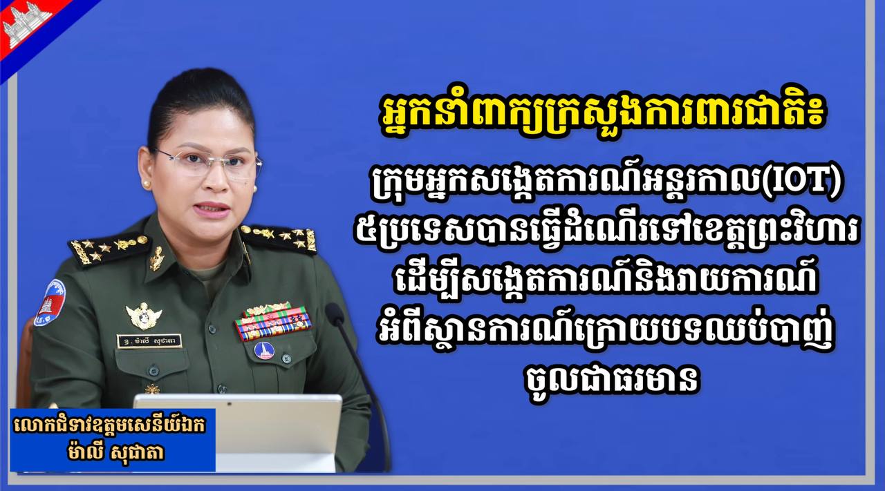 អ្នកនាំពាក្យក្រសួងការពារជាតិ៖ក្រុមអ្នកសង្កេតការណ៍អន្តរកាល(IOT) ៥ប្រទេសបានធ្វើដំណើរទៅខេត្តព្រះវិហារដើម្បីសង្កេតការណ៍ និងរាយការណ៍អំពីស្ថានការណ៍ក្រោយបទឈប់បាញ់ចូលជាធរមាន
