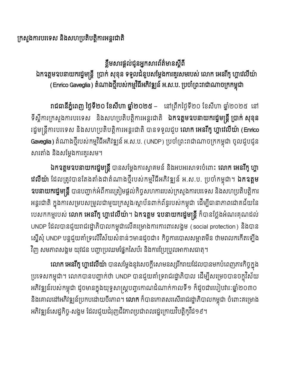 នៅព្រឹកថ្ងៃទី២០ ខែសីហា ឆ្នាំ២០២៥ ឯកឧត្តមឧបនាយករដ្ឋមន្ត្រី ប្រាក់ សុខុន រដ្ឋមន្រ្តីក្រសួងការបរទេស និងសហប្រតិបត្តិការអន្តរជាតិ បានទទួលជំនួបសម្តែងការគួរសម និងទទួលសារតាំងពីលោក អេនរីកូ ហ្គាវេលីយ៉ា (Enrico Gaveglia) តំណាងថ្មីនៃកម្មវិធីអភិវឌ្ឍន៍ អ.ស.ប. (UNDP) ប្រចាំកម្ពុជា។