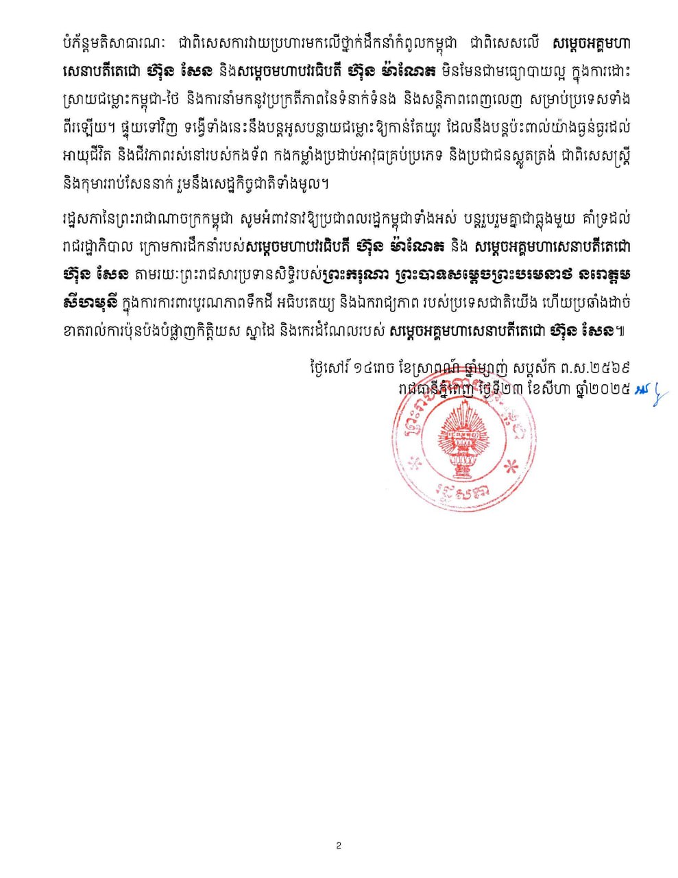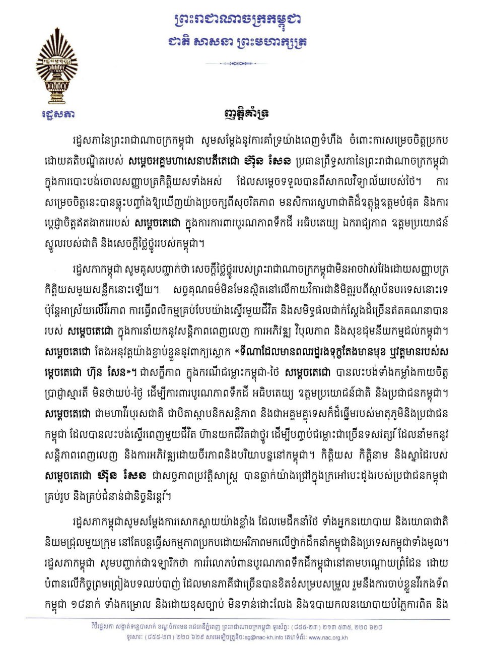 រដ្ឋសភានៃព្រះរាជាណាចក្រកម្ពុជាបានប្រកាសគាំទ្រយ៉ាងពេញទំហឹងចំពោះការសម្រេចចិត្តប្រកបដោយគតិបណ្ឌិតរបស់សម្តេចតេជោ ហ៊ុន សែន ប្រធានព្រឹទ្ធសភា ក្នុងការបោះបង់ចោលសញ្ញាបត្រកិត្តិយសទាំងអស់ដែលសម្តេចទទួលបានពីសាកលវិទ្យាល័យរបស់ថៃ។ ការសម្រេចចិត្តនេះបានឆ្លុះបញ្ចាំងឱ្យឃើញយ៉ាងប្រចក្សពីសុចរិតភាព មនសិការស្នេហាជាតិដ៏ឧត្តុង្គឧត្តមបំផុតនិងការប្តេជ្ញាចិត្តឥតងាករេរបស់ សម្តេចតេជោ ក្នុងការការពារបូរណភាពទឹកដី អធិបតេយ្យ ឯករាជ្យភាព ឧត្តមប្រយោជន៍ស្នូលរបស់ជាតិ និងសេចក្តីថ្លៃថ្នូររបស់កម្ពុជា។