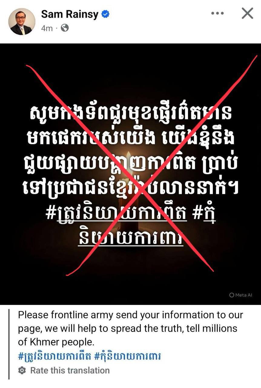 ថ្ងៃនេះ ខ្ញុំបានឃើញសារបង្ហោះរបស់ទណ្ឌិតក្បត់ជាតិ សម រង្ស៊ី ដែលបំផុសឱ្យកងទ័ពជួរមុខផ្ញើព័ត៌មានទៅកាន់ផេករបស់ខ្លួន ដើម្បីជនក្បត់ជាតិរូបនេះយកទៅបង្ហោះផ្សព្វផ្សាយ និងអួតខ្លួនឯងដូចជាអ្នកស្រឡាញ់ជាតិខ្លាំងណាស់ ក្រោមលេសដែលជននេះនិយាយថា ដើម្បីបង្ហាញការពិត។