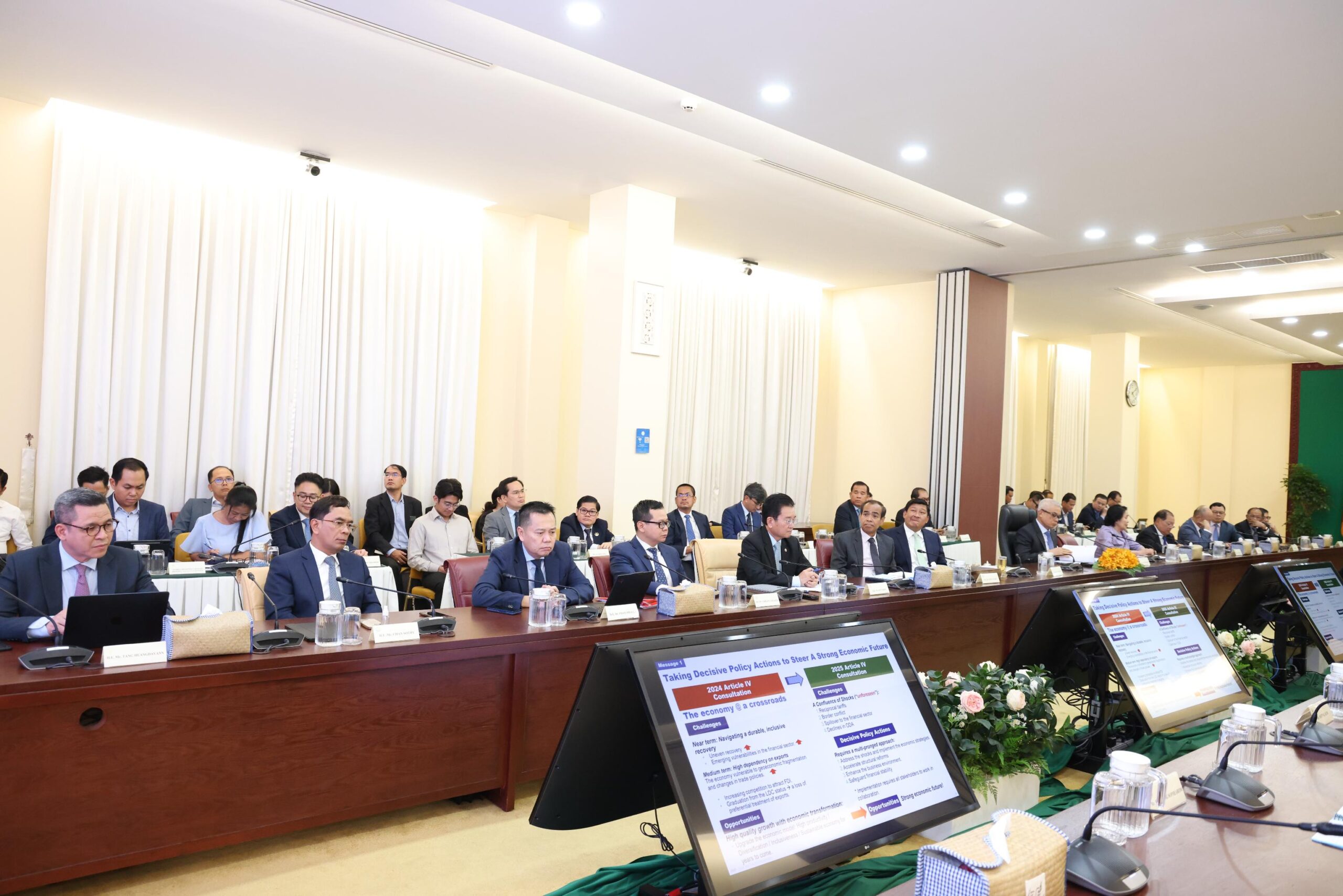 ជាមួយគ្នា, លោកប្រធានក្រុមបេសកកម្ម បានលើកឡើងថា សេដ្ឋកិច្ចកម្ពុជានឹងបន្តចលនការក្នុងគន្លងនៃកំណើនរឹងមាំ សម្រាប់រយៈពេលមធ្យមខាងមុខ ប៉ុន្តែគឺចាំបាច់ត្រូវជំរុញការអនុវត្តការងារកែទម្រង់ និងគោលនយោបាយមុតស្រួច ប្រកបដោយប្រសិទ្ធភាព និងទាន់ពេលវេលា។ ក្នុងនោះ, ការកៀរគរចំណូលនៅតែបន្តជាអាទិភាព ក្នុងការបង្កើនឡើងវិញនូវទ្រនាប់ថវិកាជាតិ ស្របពេលដែលរាជរដ្ឋាភិបាលបន្តយកចិត្តទុកដាក់ខ្ពស់ ក្នុងការដាក់ចេញនូវវិធានការអន្តរាគមន៍ចំពោះមុខ និងការបន្តលើកកម្ពស់ផលិតភាព និងសមត្ថភាពពលកម្ម, ការបង្កើនភាពប្រកួតប្រជែង, ការធ្វើពិពិធកម្មមូលដ្ឋានសេដ្ឋកិច្ច តាមរយៈការដាក់ចេញនូវគោលនយោបាយចម្រុះ (mixed policy) រវាងគោលនយោបាយសារពើពន្ធ, គោលនយោបាយរូបិយវត្ថុ, និងការកែទម្រង់ជារចនាសម្ព័ន្ធ។