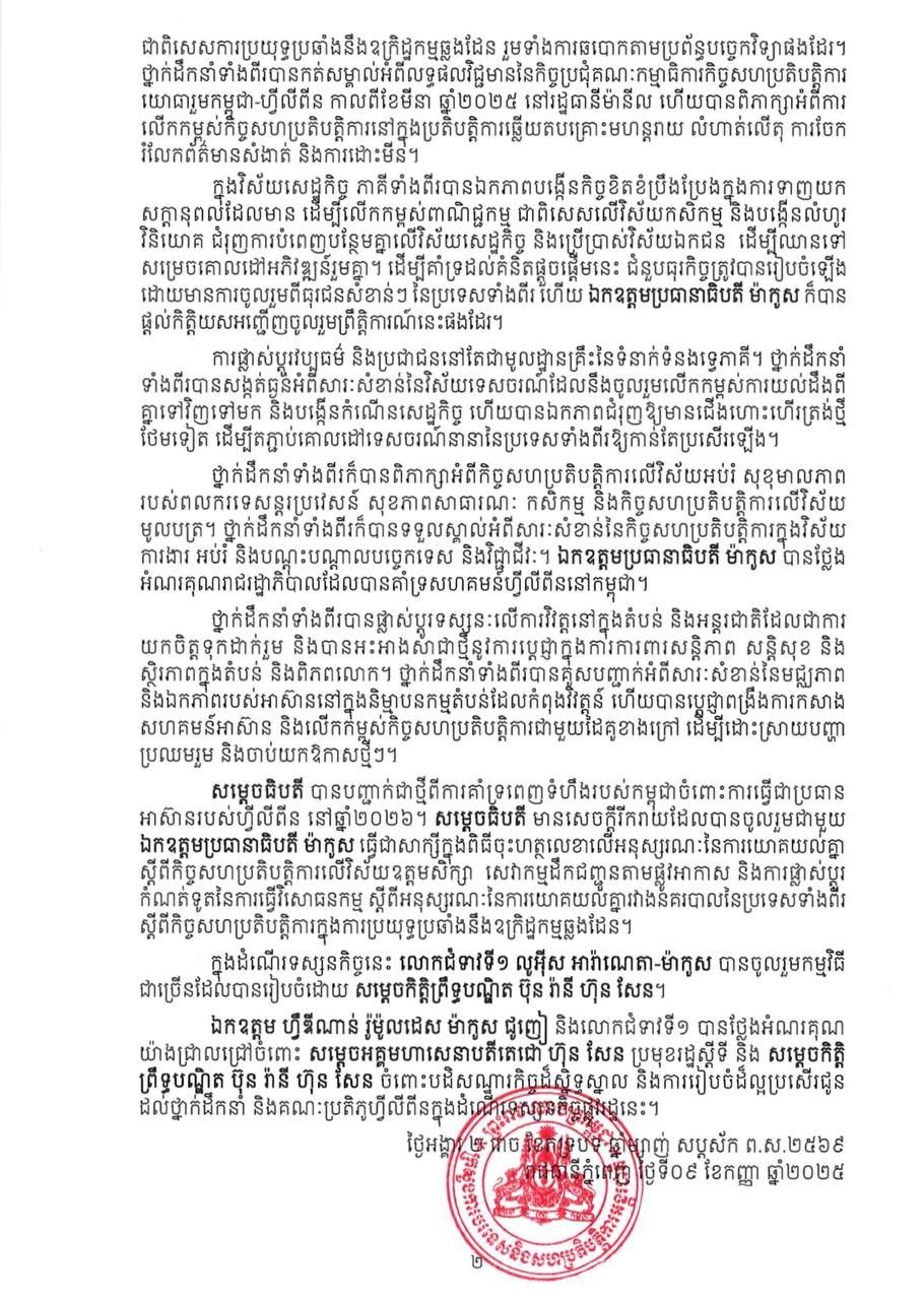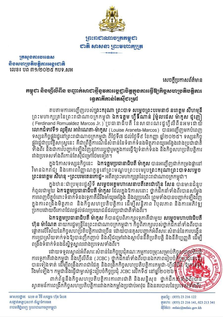 យោងតាមសេចក្តីប្រកាសព័ត៌មានរបស់ក្រសួងការបរទេស និងកិច្ចសហប្រតិបត្តិការអន្តរជាតិ នៅថ្ងៃទី៩ ខែកញ្ញា ឆ្នាំ២០២៥ បានឱ្យដឹងថា ដំណើរបំពេញទស្សនកិច្ចផ្លូវរដ្ឋនៅកម្ពុជារបស់ឯកឧត្តម ហ្វឺឌីណាន់ រ៉ូម៉ូលដេស ម៉ាកូស ជូញៀ ប្រធានាធិបតីនៃសាធារណរដ្ឋហ្វីលីពីន អមដោយ លោកជំទាវទី១ លូអ៉ឺស អារ៉ាណេតា-ម៉ាកូស ពីថ្ងៃទី៧ ខែកញ្ញា ដល់ថ្ងៃទី៩ ខែកញ្ញា ត្រូវបានបញ្ចប់ ដែលនេះគឺជាព្រឹត្តិការណ៍ដ៏សំខាន់នៃទំនាក់ទំនងមិត្តភាពយូរអង្វែងរវាងប្រជាជាតិទាំងពីរ និងជាការបញ្ជាក់ឡើងវិញនូវការប្តេជ្ញារួមក្នុងការធ្វើឱ្យទំនាក់ទំនង និងកិច្ចសហប្រតិបត្តិការ រវាងប្រទេសទាំងពីរកាន់តែស៊ីជម្រៅថែមទៀត។