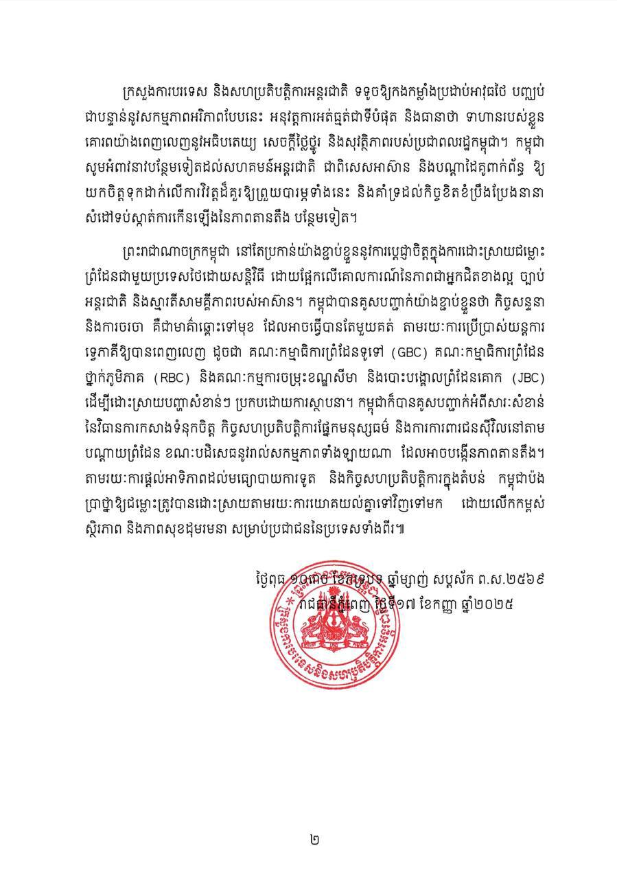 ក្រសួងការបរទេស និងសហប្រតិបត្តិការអន្តរជាតិទទូចឱ្យកងកម្លាំងប្រដាប់អាវុធថៃបញ្ឈប់ជាបន្ទាន់នូវសកម្មភាពអរិភាពបែបនេះ អនុវត្តការអត់ធ្មត់ជាទីបំផុត និងធានាថា ទាហានរបស់ខ្លួនគោរពយ៉ាងពេញលេញនូវអធិបតេយ្យ សេចក្តីថ្លៃថ្នូរ និងសុវត្ថិភាពរបស់ប្រជាពលរដ្ឋកម្ពុជា។ កម្ពុជាសូមអំពាវនាវបន្ថែមទៀតដល់សហគមន៍អន្តរជាតិ ជាពិសេសអាស៊ាន និងបណ្តាដៃគូពាក់ព័ន្ធឱ្យយកចិត្តទុកដាក់លើការវិវត្តដ៏គួរឱ្យព្រួយបារម្ភទាំងនេះ និងគាំទ្រដល់កិច្ចខិតខំប្រឹងប្រែងនានាសំដៅទប់ស្កាត់ការកើនឡើងនៃភាពតានតឹងបន្ថែមទៀត៕
