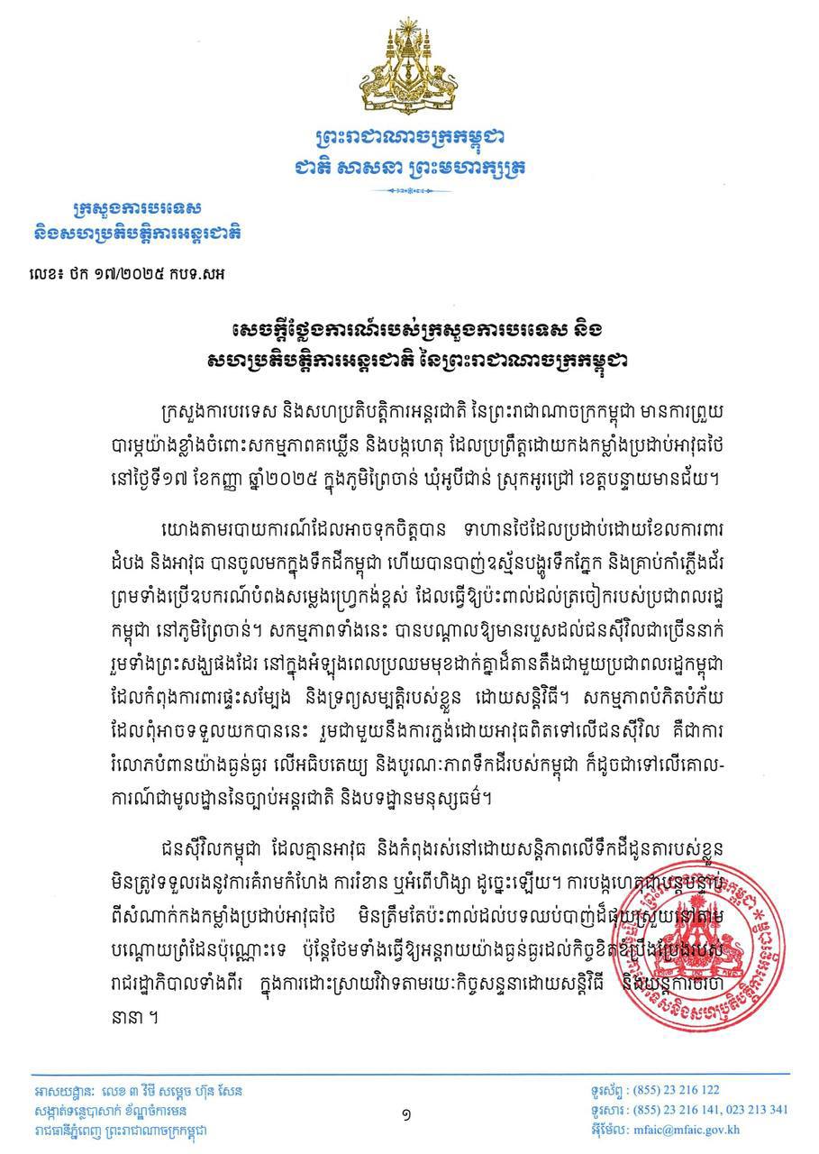 យោងតាមសេចក្តីថ្លែងការណ៍របស់ក្រសួងការបរទេស និងសហប្រតិបត្តិការអន្តរជាតិចុះផ្សាយថ្ងៃទី១៧ ខែកញ្ញា ឆ្នាំ២០២៥ បានឱ្យដឹងថា ក្រសួងការបរទេសនិងសហប្រតិបត្តិការអន្តរជាតិនៃព្រះរាជាណាចក្រកម្ពុជាមានការព្រួយបារម្ភយ៉ាងខ្លាំងចំពោះសកម្មភាពគឃើ្លន និងបង្កហេតុ ដែលប្រព្រឹត្តដោយកងកម្លាំងប្រដាប់អាវុធថៃនៅថ្ងៃទី១៧ ខែកញ្ញា ឆ្នាំ២០២៥ ក្នុងភូមិព្រៃចាន់ ឃុំអូបីជាន់ ស្រុកអូរជ្រៅ ខេត្តបន្ទាយមានជ័យ។