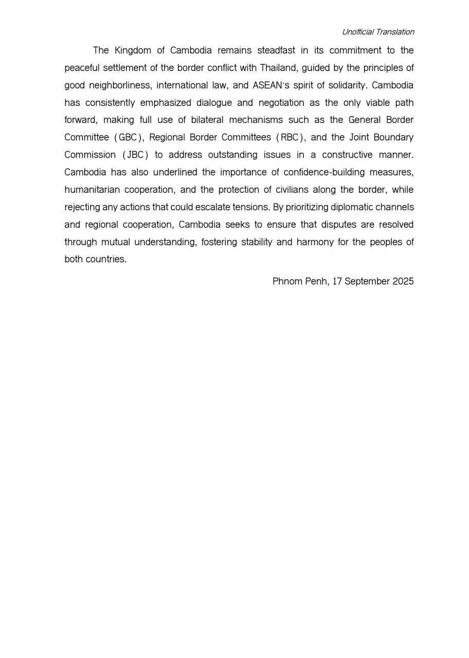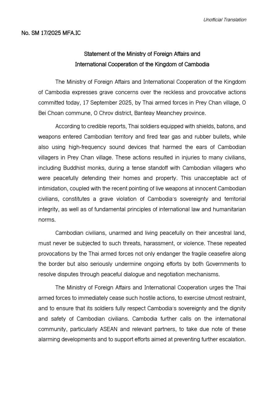 ជនស៊ីវិលកម្ពុជា ដែលគ្មានអាវុធ និងកំពុងរស់នៅដោយសន្តិភាពលើទឹកដីដូនតារបស់ខ្លួនមិនត្រូវទទួលរងនូវការគំរាមកំហែង ការរំខាន ឬអំពើហិង្សាដូច្នេះឡើយ។ ការបង្កហេតុជាបន្តបន្ទាប់ពីសំណាក់កងកម្លាំងប្រដាប់អាវុធថៃ មិនត្រឹមតែប៉ះពាល់ដល់បទឈប់បាញ់ដ៏ផុយស្រួយនៅតាមបណ្តោយព្រំដែនប៉ុណ្ណោះទេ ប៉ុន្តែថែមទាំងធ្វើឱ្យអន្តរាយយ៉ាងធ្ងន់ធ្ងរដល់កិច្ចខិតខំប្រឹងប្រែងរបស់រាជរដ្ឋាភិបាលទាំងពីរក្នុងការដោះស្រាយវិវាទតាមរយៈកិច្ចសន្ទនាដោយសន្តិវិធី និងយន្តការចរចានានា។