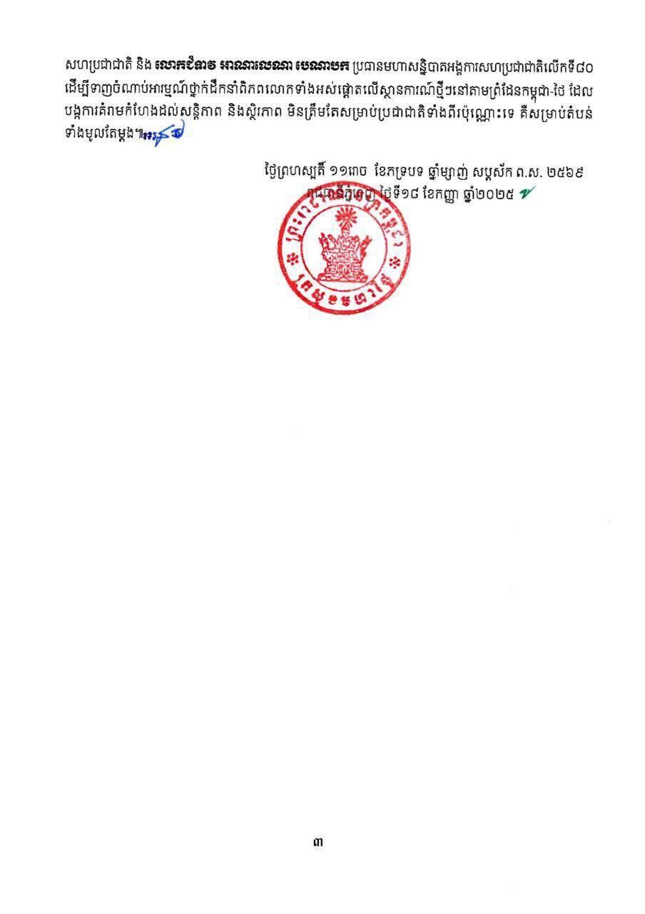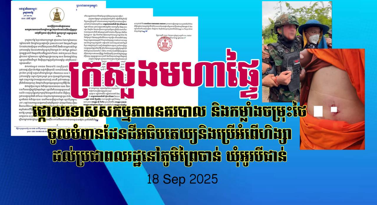 នៅថ្ងៃទី១៨ ខែកញ្ញា ឆ្នាំ២០២៥ ក្រសួងមហាផ្ទៃចេញសេចក្តីថ្លែងការណ៍ថ្កោលទោសសកម្មភាពកម្លាំងយោធាថៃ និងកម្លាំងចម្រុះផ្សេងទៀត ដែលម្ដងហើយម្ដងទៀត បានបង្កសកម្មភាពអមិត្តបំពានដោយឥតអៀនខ្មាស មកលើដែនបូរណភាពទឹកដី និងអធិបតេយ្យភាពជាតិកម្ពុជា ព្រមទាំងធ្វើទុក្ខបុកម្នេញលើប្រជាពលរដ្ឋខ្មែរ ដែលរស់នៅតាមខ្សែបន្ទាត់ព្រំដែនកម្ពុជា-ថៃ កាលពីថ្ងៃទី១៧ ខែកញ្ញា ឆ្នាំ២០២៥ នៅភូមិព្រៃចាន់ ឃុំអូរបីជាន់ ស្រុកអូរជ្រៅ ខេត្ត