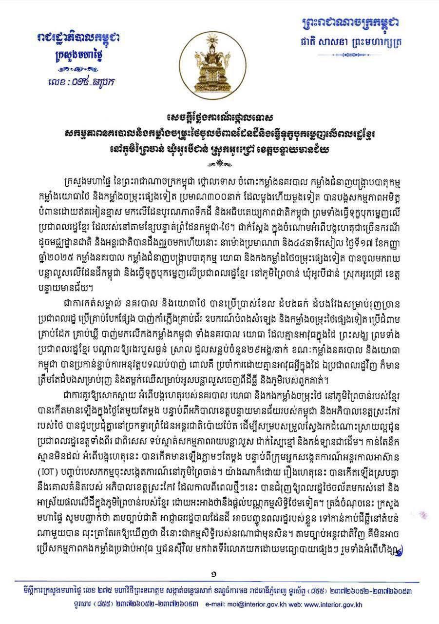ក្រសួងមហាផ្ទៃ ថ្កោលទោសសកម្មភាពនគរបាល និងកម្លាំងចម្រុះថៃចូលបំពានដែនដីអធិបតេយ្យ និងប្រើអំពើហិង្សាដល់ប្រជាពលរដ្ឋនៅភូមិព្រៃចាន់ ឃុំអូរបីជាន់
