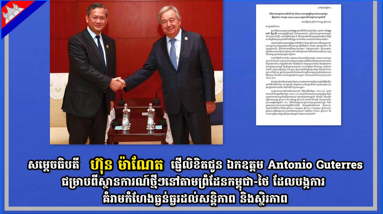 សម្តេចធិបតី ហ៊ុន ម៉ាណែត ផ្ញើលិខិតជូន ឯកឧត្តម Antonio Guterres ជម្រាបពីស្ថានការណ៍ថ្មីៗនៅតាមព្រំដែនកម្ពុជា-ថៃ ដែលបង្កការគំរាមកំហែងធ្ងន់ធ្ងរដល់សន្តិភាព និងស្ថិរភាព