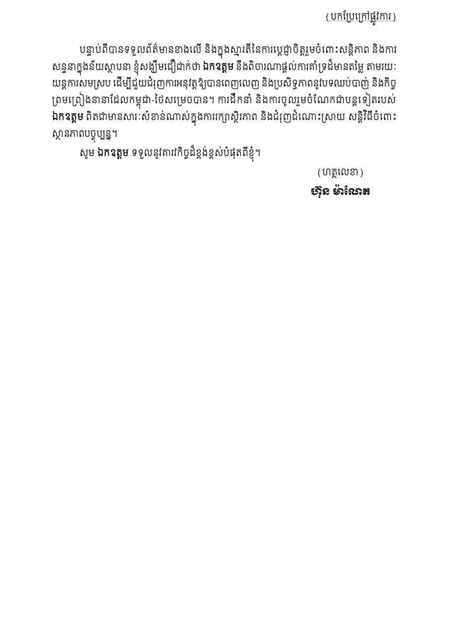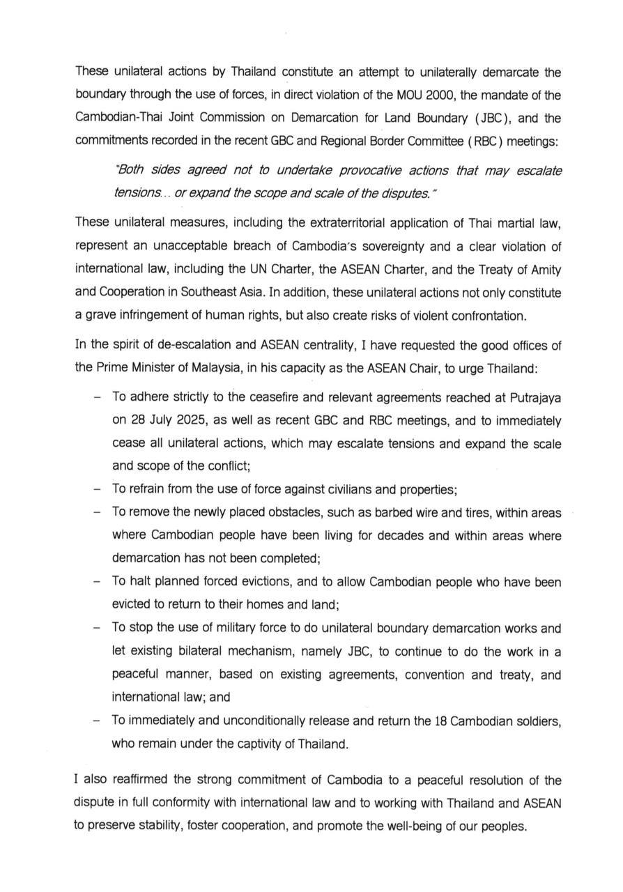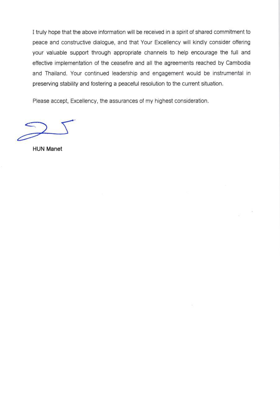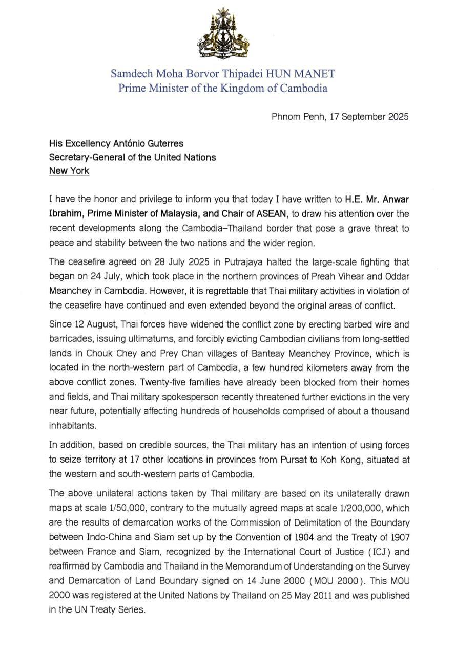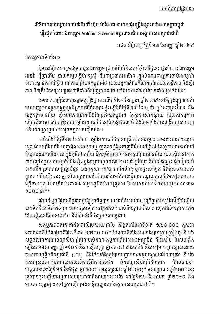 យោងតាមលិខិតផ្លូវការរបស់សម្តេចធិបតី ហ៊ុន ម៉ាណែត នាយករដ្ឋមន្រ្តីនៃព្រះរាជាណាចក្រកម្ពុជាផ្ញើរជូនឯកឧត្តម Antonio Guterres អគ្គលេខាធិការអង្គការសហប្រជាជាតិនៅថ្ងៃទី១៧ ខែកញ្ញា ឆ្នាំ២០២៥ បានឱ្យដឹងថា សម្តេចបានផ្ញើរលិខិតទៅកាន់ឯកឧត្តម Anwar Ibrahim នាយករដ្ឋមន្រ្តីម៉ាឡេស៊ី និងជាប្រធានអាស៊ាន ក្នុងបំណងទាញការចាប់អារម្មណ៍ចំពោះស្ថានការណ៍ថ្មីៗ នៅតាមព្រំដែនកម្ពុជា-ថៃ ដែលបង្កការគំរាមកំហែងធ្ងន់ធ្ងរដល់សន្តិភាព និងស្ថិរភាពមិនត្រឹមតែសម្រាប់ប្រជាជាតិទាំងពីរប៉ុណ្ណោះទេ ថែមទាំងប៉ះពាល់ដល់តំបន់ទាំងមូលផងដែរ។