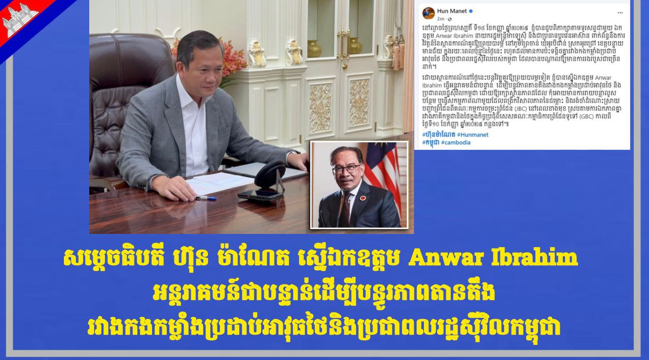 សម្តេចធិបតី ហ៊ុន ម៉ាណែត ស្នើឯកឧត្ដម Anwar Ibrahim អន្តរាគមន៍ជាបន្ទាន់ដើម្បីបន្ធូរភាពតានតឹងរវាងកងកម្លាំងប្រដាប់អាវុធថៃនិងប្រជាពលរដ្ឋស៊ីវិលកម្ពុជា