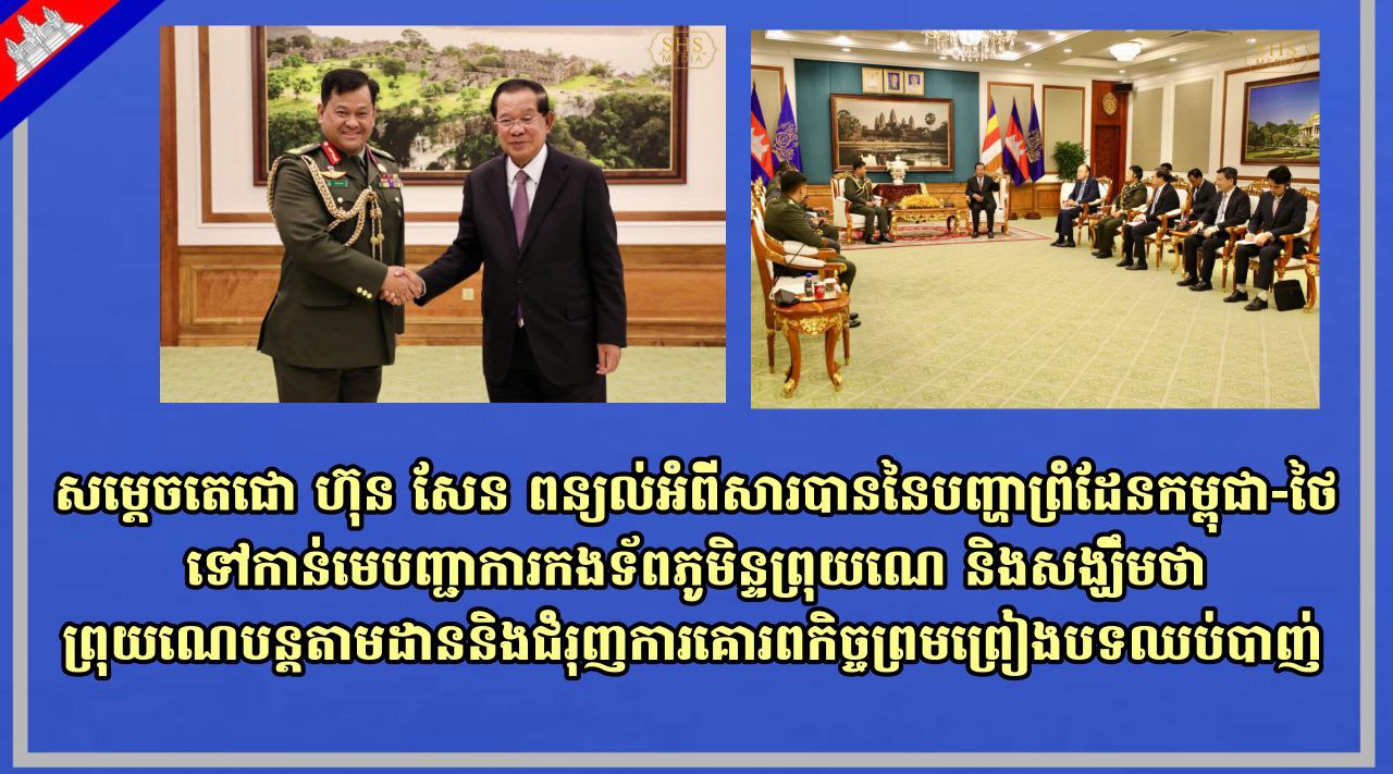 សម្ដេចតេជោ ហ៊ុន សែន ពន្យល់អំពីសារបាននៃបញ្ហាព្រំដែនកម្ពុជា-ថៃទៅកាន់មេបញ្ជាការកងទ័ពភូមិន្ទព្រុយណេ និងសង្ឃឹមថាព្រុយណេបន្ដតាមដាននិងជំរុញការគោរពកិច្ចព្រមព្រៀងបទឈប់បាញ់