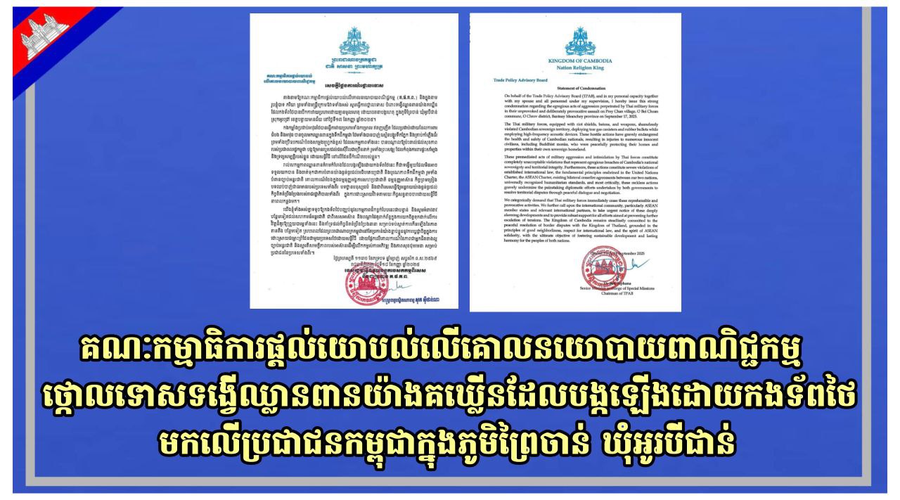 គណៈកម្មាធិការផ្តល់យោបល់លើគោលនយោបាយពណិជ្ជកម្ម(គ.ជ.គ.ព.) បានចេញសេចក្តីថ្លែងការណ៍ថ្កោលទោស ចំពោះទង្វើឈ្លានពានយ៉ាងគឃ្លីនដែលកងទ័ពថៃបានបើកការវាយប្រហារដោយគ្មានមូលហេតុ ដោយចេតនាបង្កហេតុ ក្នុងភូមិព្រៃចាន់ ឃុំអូរបីជាន់ ស្រុកអូរជ្រៅ ខេត្តបន្ទាយមានជ័យនៅថ្ងៃទី១៧ ខែកញ្ញា ឆ្នាំ២០២៥ ដែលកងកម្លាំងប្រដាប់អាវុធថៃបានធ្វើការវាយប្រហារទាំងកម្រោលឥតញញើតដែលប្រដាប់ដោយខែលការពារ ដំបង និងអាវុធ បានចូលមកឈ្លានពានក្នុងទឹកដីកម្ពុជា ថែមទាំងបានបាញ់ឧស្ម័នបង្ហូរទឹកភ្នែក និងគ្រាប់កាំភ្លើងជ័រ ព្រមទាំងប្រើឧបករណ៍បំពងសម្លេងហ្វ្រេកង់ខ្ពស់ដែលសកម្មភាពទាំងនេះបានបណ្តាលឱ្យប៉ះពាល់ដល់សុខភាពរបស់ប្រជាពលរដ្ឋកម្ពុជាបង្កឱ្យមានរបួសដល់ជនស៊ីវិលជាច្រើននាក់រួមទាំងព្រះសង្ឃដែលកំពុងការពារផ្ទះសម្បែង និងទ្រព្យសម្បត្តិរបស់ខ្លួនដោយសន្តិវិធីនៅលើដែនដីកំណើតរបស់ខ្លួន។