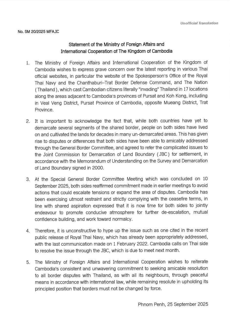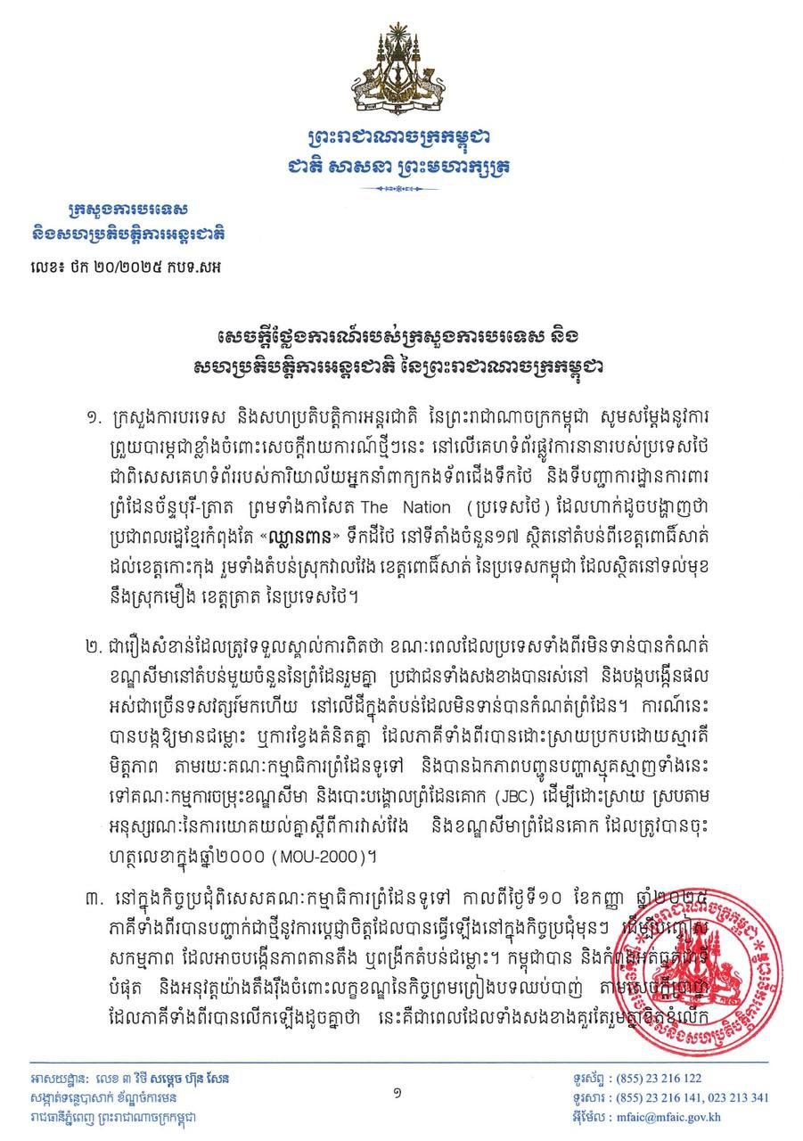 យោងតាមសេចក្តីថ្លែងការណ៍របស់ក្រសួងការបរទេស និងសហប្រតិបត្តិការអន្តរជាតិ នៃព្រះរាជាណាចក្រកម្ពុជា នៅថ្ងៃទី២៥ ខែកញ្ញា ឆ្នាំ២០២៥ បានបញ្ជាក់ថា កម្ពុជាសម្ដែងនូវការព្រួយបារម្ភជាខ្លាំងចំពោះសេចក្តីរាយការណ៍ថ្មីៗនេះ នៅលើគេហទំព័រផ្លូវការនានារបស់ប្រទេសថៃ ជាពិសេសគេហទំព័ររបស់ការិយាល័យអ្នកនាំពាក្យកងទ័ពជើងទឹក និងទីបញ្ជាការដ្ឋានការពារព្រំដែនច័ន្ទបុរី-ត្រាត ព្រមទាំងកាសែត The Nation (ប្រទេសថៃ) ដែលហាក់ដូចបង្ហាញថាប្រជាពលរដ្ឋខ្មែរកំពុងតែ «ឈ្លានពាន» ទឹកដីថៃ នៅទីតាំងចំនួន១៧ ស្ថិតនៅតំបន់ពីខេត្តពោធិ៍សាត់ដល់ខេត្តកោះកុង រួមទាំងតំបន់ស្រុកវាលវែង ខេត្តពោធិ៍សាត់ នៃប្រទេសកម្ពុជា ដែលស្ថិតនៅទល់មុខនឹងស្រុកមឿង ខេត្តត្រាត នៃប្រទេសថៃ។