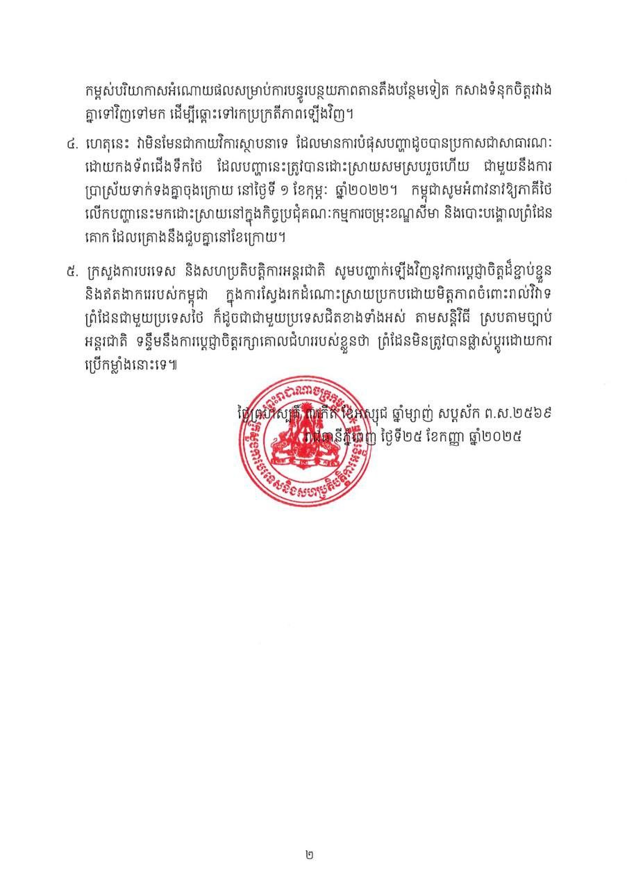 ក្រសួងការបរទេសកម្ពុជា បានបញ្ជាក់ឡើងវិញនូវការប្តេជ្ញាចិត្តដ៏ខ្ជាប់ខ្ជួននិងឥតងាករេរបស់កម្ពុជា ក្នុងការស្វែងរកដំណោះស្រាយប្រកបដោយមិត្តភាពចំពោះរាល់វិវាទព្រំដែនជាមួយប្រទេសថៃ ក៏ដូចជាជាមួយប្រទេសជិតខាងទាំងអស់ តាមសន្តិវិធី ស្របតាមច្បាប់អន្តរជាតិ ទន្ទឹមនឹងការប្តេជ្ញាចិត្តរក្សាគោលជំហររបស់ខ្លួនថា ព្រំដែនមិនត្រូវបានផ្លាស់ប្តូរដោយការប្រើកម្លាំងនោះទេ៕