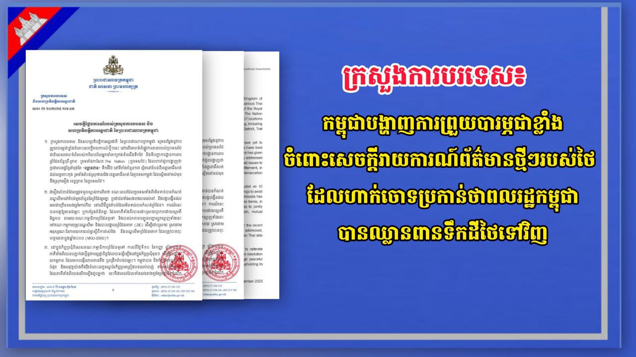 ក្រសួងការបរទេស៖ កម្ពុជាបង្ហាញការព្រួយបារម្ភជាខ្លាំង ចំពោះសេចក្តីរាយការណ៍ព័ត៌មានថ្មីៗរបស់ថៃ ដែលហាក់ចោទប្រកាន់ថាពលរដ្ឋកម្ពុជាបានឈ្លានពានទឹកដីថៃទៅវិញ