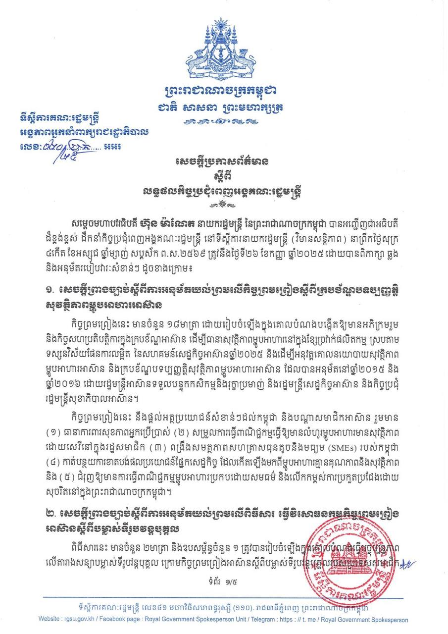 សម្តេចធិបតី ហ៊ុន ម៉ាណែត នាយករដ្ឋមន្រ្តីនៃព្រះរាជាណាចក្រកម្ពុជា បានគូសបញ្ជាក់ថា បទពិសោធន៍នៃសង្រ្គាមរ៉ាំរ៉ៃនៅកម្ពុជាបានបង្ហាញថាសង្រ្គាមមិនអាចបញ្ចប់ដោយការធ្វើសង្រ្គាមបានទេ ពោលគឺមានតែការចរចាដោយសន្តិវិធីប៉ុណ្ណោះដែលអាចរកដំណោះស្រាយបានប្រកបដោយសុខសន្តិភាពដែលបង្កលក្ខណៈងាយស្រួល ឱ្យប្រជាពលរដ្ឋភៀសសឹកអាចវិលត្រឡប់ទៅកាន់ភូមិឋានរបស់ខ្លួនវិញ។ នេះបើយោងតាមសេចក្តីប្រកាសព័ត៌មានស្តីពីលទ្ធផលនៃកិច្ចប្រជុំពេញអង្គគណៈរដ្ឋមន្រ្តី នៅថ្ងៃទី២៦ ខែកញ្ញា ឆ្នាំ២០២៥។