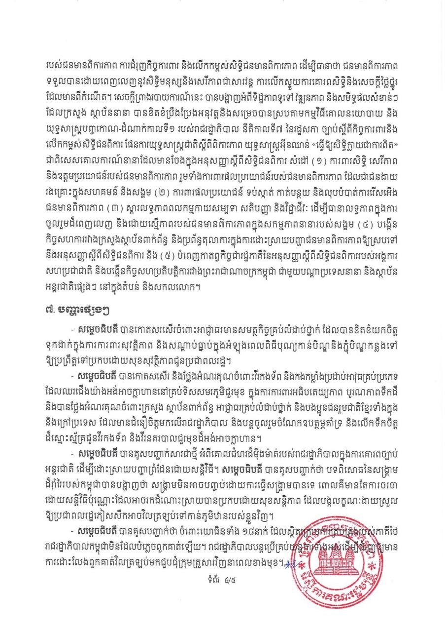 នៅក្នុងសេចក្តីប្រកាសព័ត៌មាននោះដែរបានឱ្យដឹងថា សម្តេចធិបតី ហ៊ុន ម៉ាណែត ក៏បានគូសបញ្ជាក់សាជាថ្មី អំពីគោលជំហរដ៏ម៉ឺងម៉ាត់របស់រាជរដ្ឋាភិបាលក្នុងការគោរពច្បាប់អន្តរជាតិ ដើម្បីដោះស្រាយបញ្ហាព្រំដែនដោយ សន្តិវិធី។
