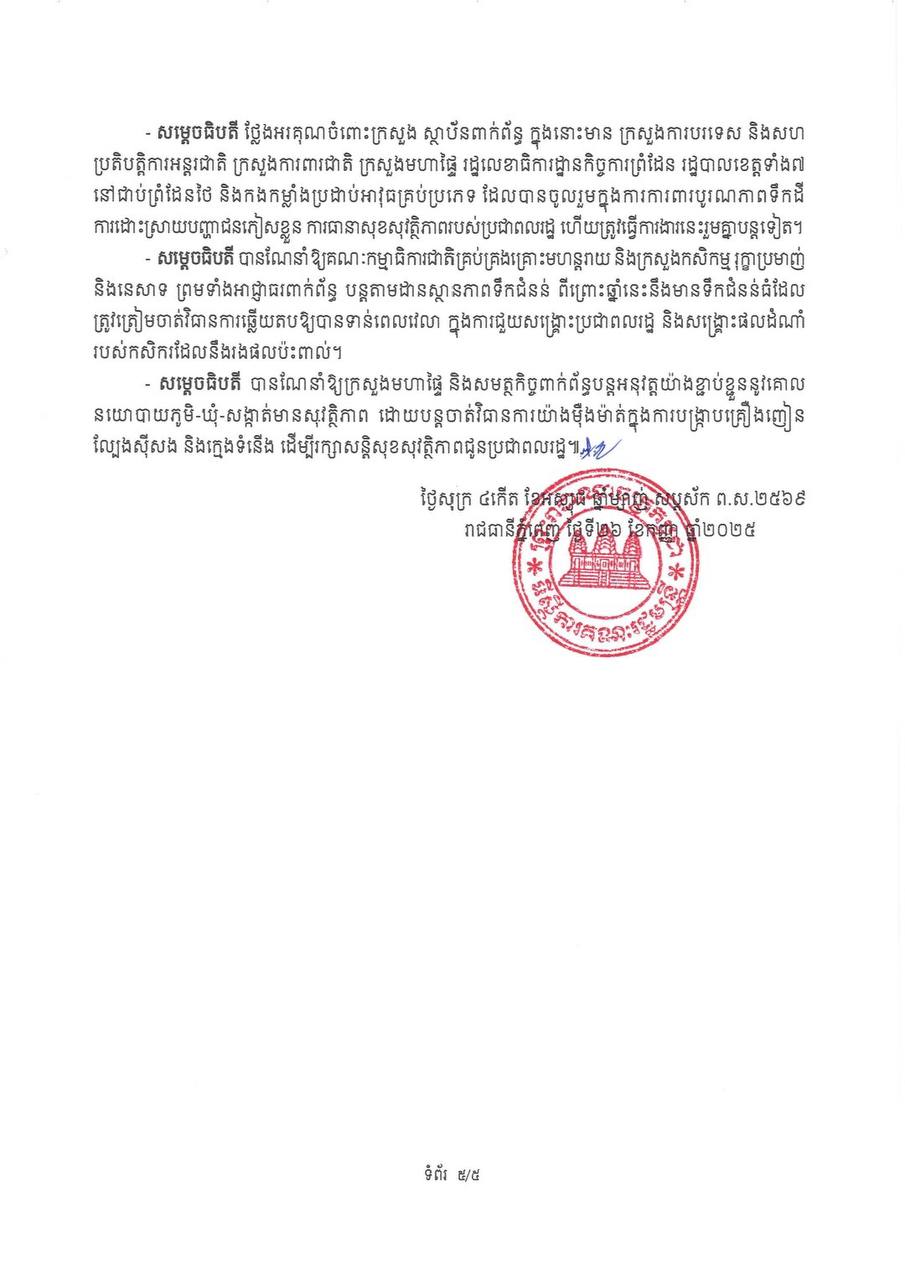 ទន្ទឹមនោះដែរ សម្តេចធិបតី ហ៊ុន ម៉ាណែត ក៏បានថ្លែងអំណរគុណចំពោះក្រសួង ស្ថាប័នពាក់ព័ន្ធក្នុងនោះមាន ក្រសួងការបរទេសនិងសហប្រតិបត្តិការអន្តរជាតិ ក្រសួងការពារជាតិ ក្រសួងមហាផ្ទៃ រដ្ឋលេខាធិការដ្ឋានកិច្ចការ ព្រំដែន រដ្ឋបាលខេត្តទាំង៧នៅជាប់ព្រំដែនថៃ និងកងកម្លាំងប្រដាប់អាវុធគ្រប់ប្រភេទដែលបានចូលរួមក្នុងការការពារបូរណភាពទឹកដី ការដោះស្រាយបញ្ហាជនភៀសខ្លួន ការធានាសុខសុវត្ថិភាពរបស់ប្រជាពលរដ្ឋ ហើយត្រូវធ្វើការងារនេះរួមគ្នាបន្តទៀត៕