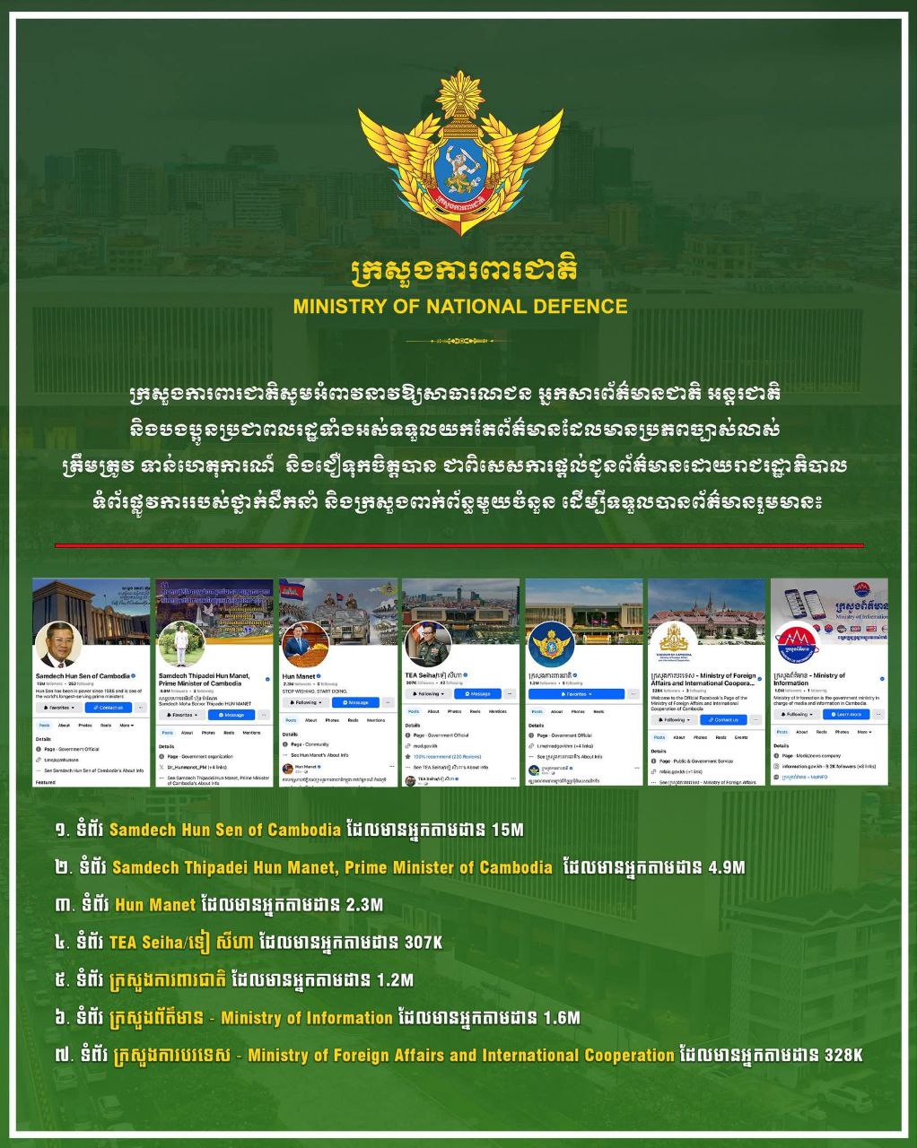៥. ទំព័រ ក្រសួងការពារជាតិ ដែលមានអ្នកតាមដាន 1.2M