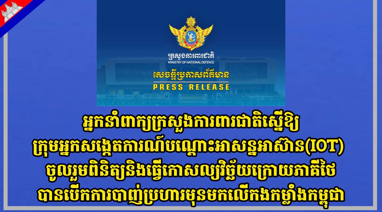 អ្នកនាំពាក្យក្រសួងការពារជាតិស្នើឱ្យក្រុមអ្នកសង្កេតការណ៍បណ្តោះអាសន្នអាស៊ាន(IOT) ចូលរួមពិនិត្យនិងធ្វើកោសល្យវិច្ឆ័យក្រោយភាគីថៃបានបើកការបាញ់ប្រហារមុនមកលើកងកម្លាំងកម្ពុជា
