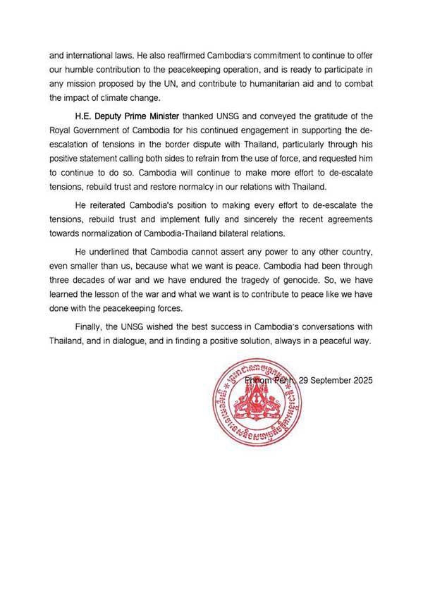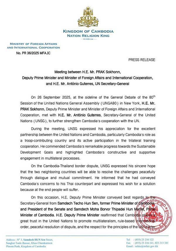 យោងតាមសេចក្តីប្រកាសព័ត៌មានរបស់ក្រសួងការបរទេស និងសហប្រតិបត្តិការអន្តរជាតិ ចុះថ្ងៃ២៩ ខែកញ្ញា ឆ្នាំ២០២៥ បានឱ្យដឹងថា នៅក្នុងជំនួបពិភាក្សាការងារទូទៅនៃកិច្ចប្រជុំលើកទី៨០ នៃមហាសន្និបាតអង្គការសហប្រជាជាតិ (UNGA80) កាលពីថ្ងៃទី២៦ ខែកញ្ញា ឆ្នាំ២០២៥ ជាមួយ ឯកឧត្តម António Guterres អគ្គលេខាធិការអង្គការសហប្រជាជាតិ (UNSG) ឯកឧត្តម ប្រាក់ សុខុន ឧបនាយករដ្ឋមន្ត្រី រដ្ឋមន្ត្រីក្រសួងការបរទេស និងសហប្រតិបត្តិការអន្តរជាតិ បានគូសបញ្ជាក់ថា កម្ពុជាមិនប្រើអំណាចទៅបំពានប្រទេសណាមួយទេ ទោះតូចជាងកម្ពុជាក៏ដោយ ព្រោះអ្វីដែលកម្ពុជាចង់បានគឺសន្តិភាព ។ កម្ពុជាបានឆ្លងកាត់សង្គ្រាមបីទសវត្សរ៍ រួចមកហើយ និងសោកនាដកម្មអំពើប្រល័យពូជសាសន៍។ ដូច្នេះ យើងបានយល់ច្បាស់ពីសង្គ្រាម ហើយអ្វីដែលយើងចង់បាន គឺសន្តិភាព។